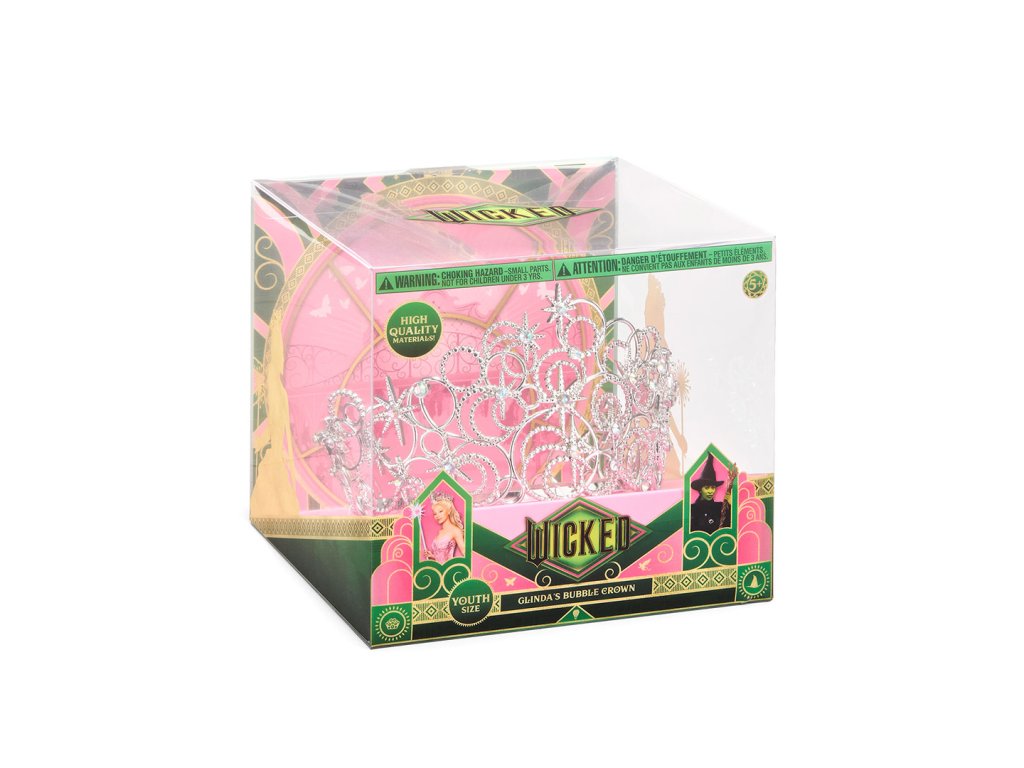 Zazářete jako Glinda, dobrá čarodějka, s touto dětskou replikou Glindiny Koruny bublin z Wicked. Koruna měří přibližně 7,5 cm na výšku a 12,5 cm v průměru. Nepokoušejte se korunu ohýbat, kov by se mohl zlomit.Doplňkové parametry