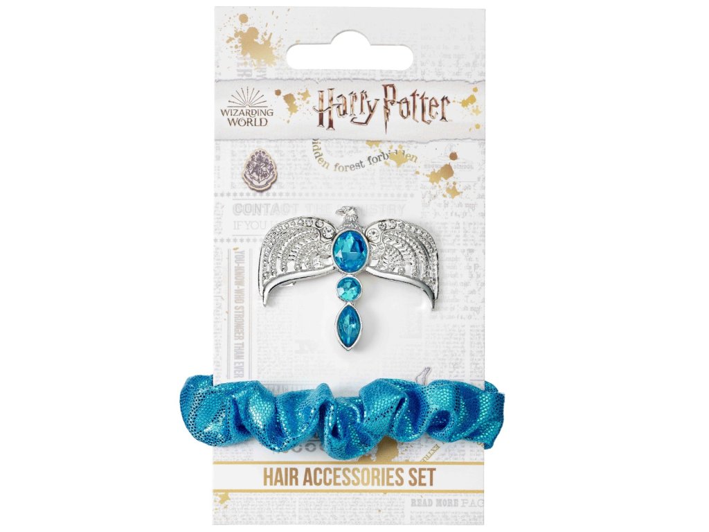 Sada ozdob do vlasů - sponka a gumička Harry Potter, skvělý dárek pro malou parádnici a milovnici kouzelného světa. Gumička v barvách havraspárské koleje, sponka obsahuje známou relikvii smrti - Diadém Roweny z Havraspáru.