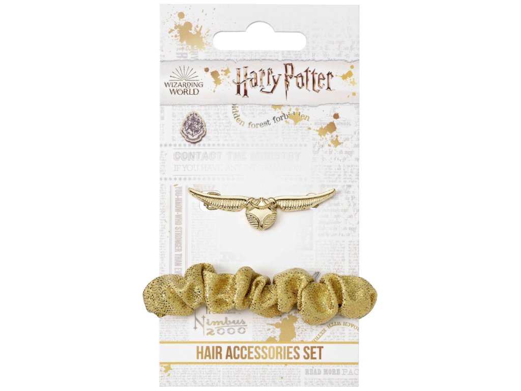 Sada ozdob do vlasů - sponka a gumička Harry Potter, skvělý dárek pro malou parádnici a milovnici kouzelného světa. Gumička v typické zlaté barvě, která reprezentuje Zlatonku, nedílnou součást oblíbeného kouzelnického sportu famfrpál.