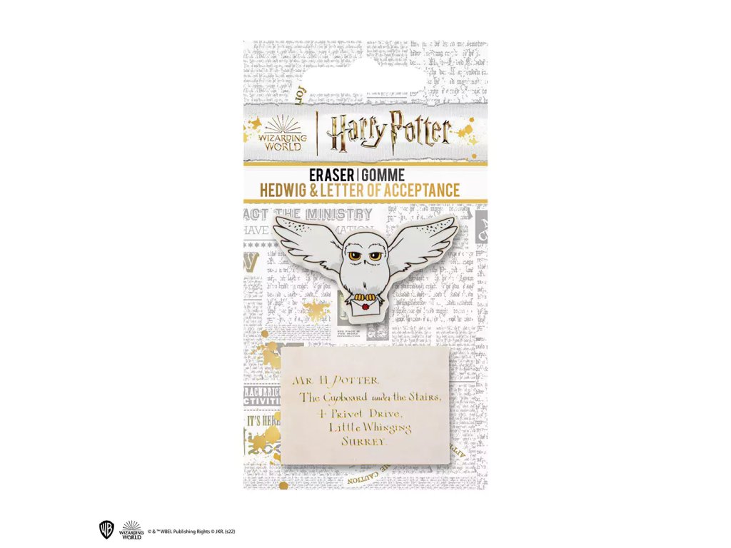 Balení obsahuje 2 kusy gum na gumování s motivem sovy Hedviky a přijímacího dopisu do Bradavic.