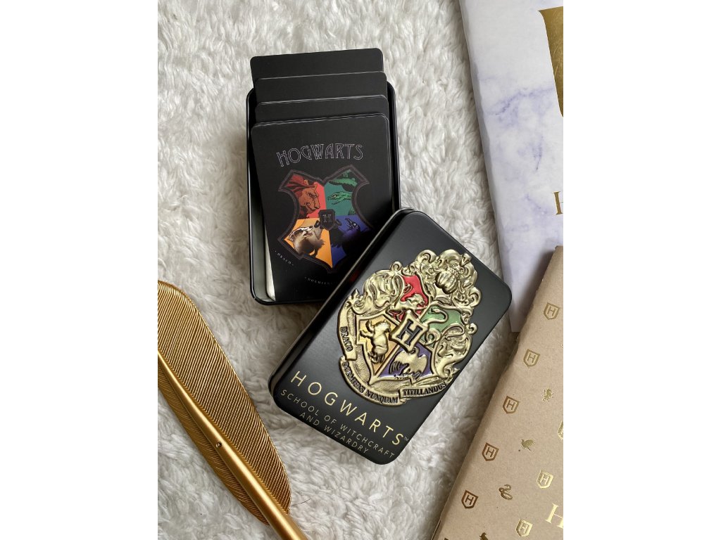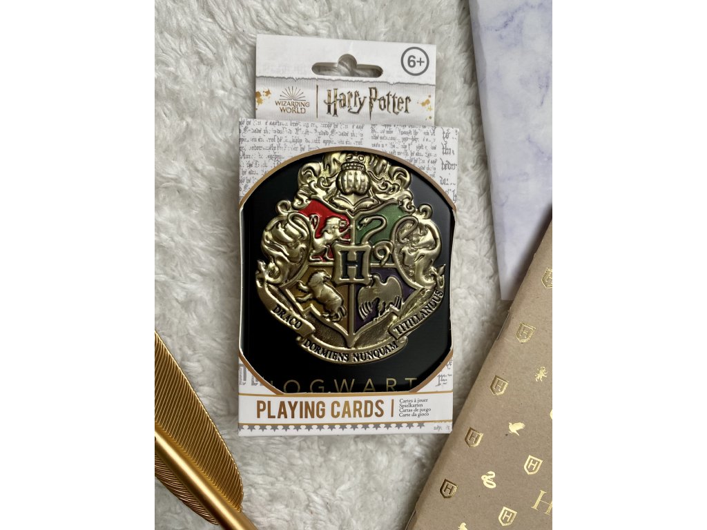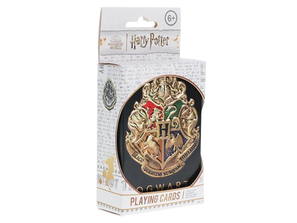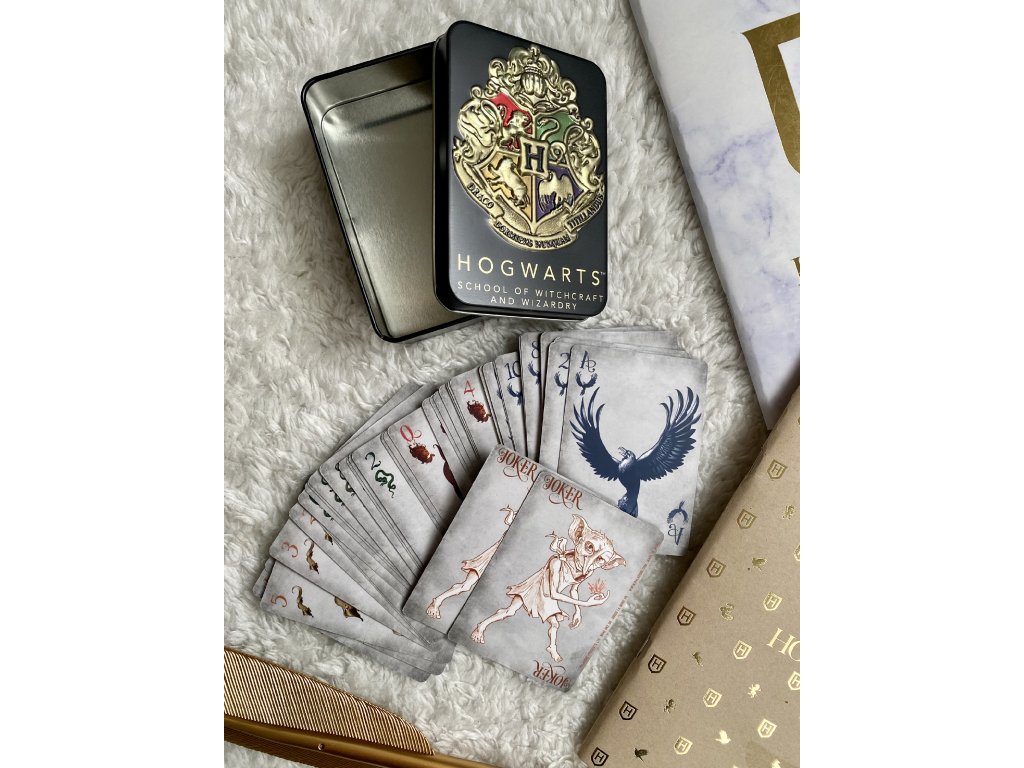 Hrací karty inspirované ságou Harry Potter. Balíček obsahuje 54 karet včetně dvou žolíků. Sada je dodávána v kovové ražené černé plechové krabičce, doplněné ikonickým erbem Bradavic.