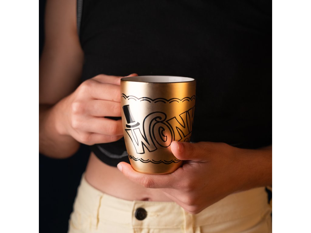 Jeho design kombinuje krásnou zlatavou barvu s nádechem třpytek v některých oblastech, připomínající zlatý lístek obsažený v čokoládových tyčinkách Wonka. Je vyroben z keramiky a má objem 350 ml. Rozměry: výška 10,4 cm, horní průměr 8,5 cm a spodní průměr 5,5 cm.Doplňkové parametry