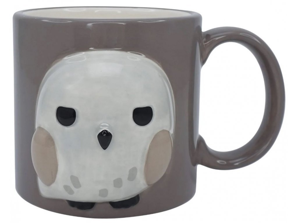 Hrnek s 3D motivem Harryho sovy Hedviky ve stylu kawaii. Ze zadní strany hrnku je nápis "Hogwarts is my home".
