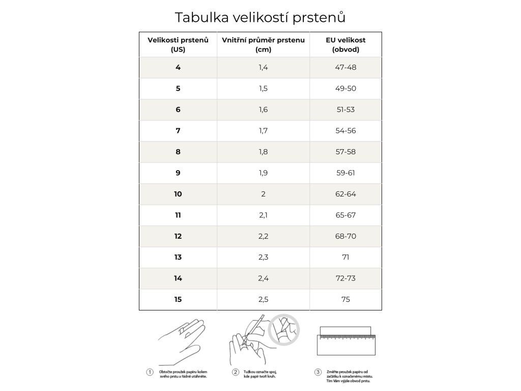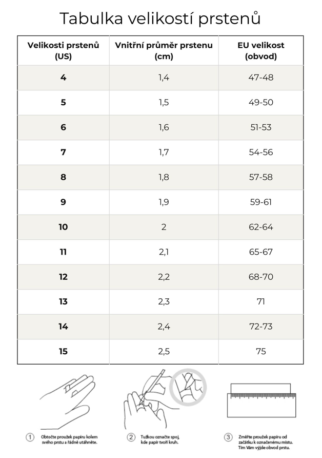 Prsten je dostupný v různých standardních US velikostech.