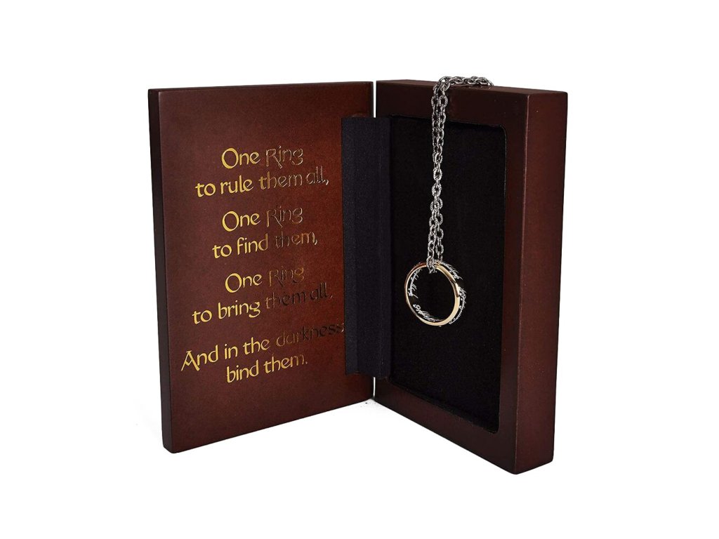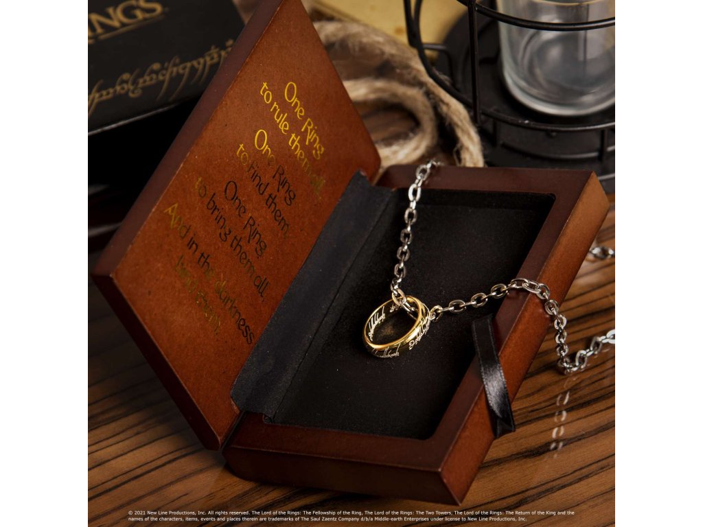 Prsten je zavěšen na nerezovém řetízku o délce 60 cm, díky čemuž jej lze nosit jako přívěsek nebo elegantně vystavit ve sbírce. Dodává se v luxusní dřevěné sběratelské krabičce, jejíž vnitřek zdobí kompletní verš Jednoho prstenu – symbol moci a osudu Středozemě.