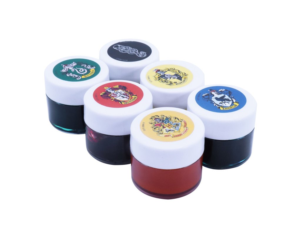 Sada obsahuje 6 kusů gelového barviva v pastelových kolejních barvách Havraspáru, Mrzimoru, Nebelvíru, Zmijozelu a také dvě další ve stylu Bradavic (zlatá) a Smrtijedů (černá). Každá má objem 10 ml.