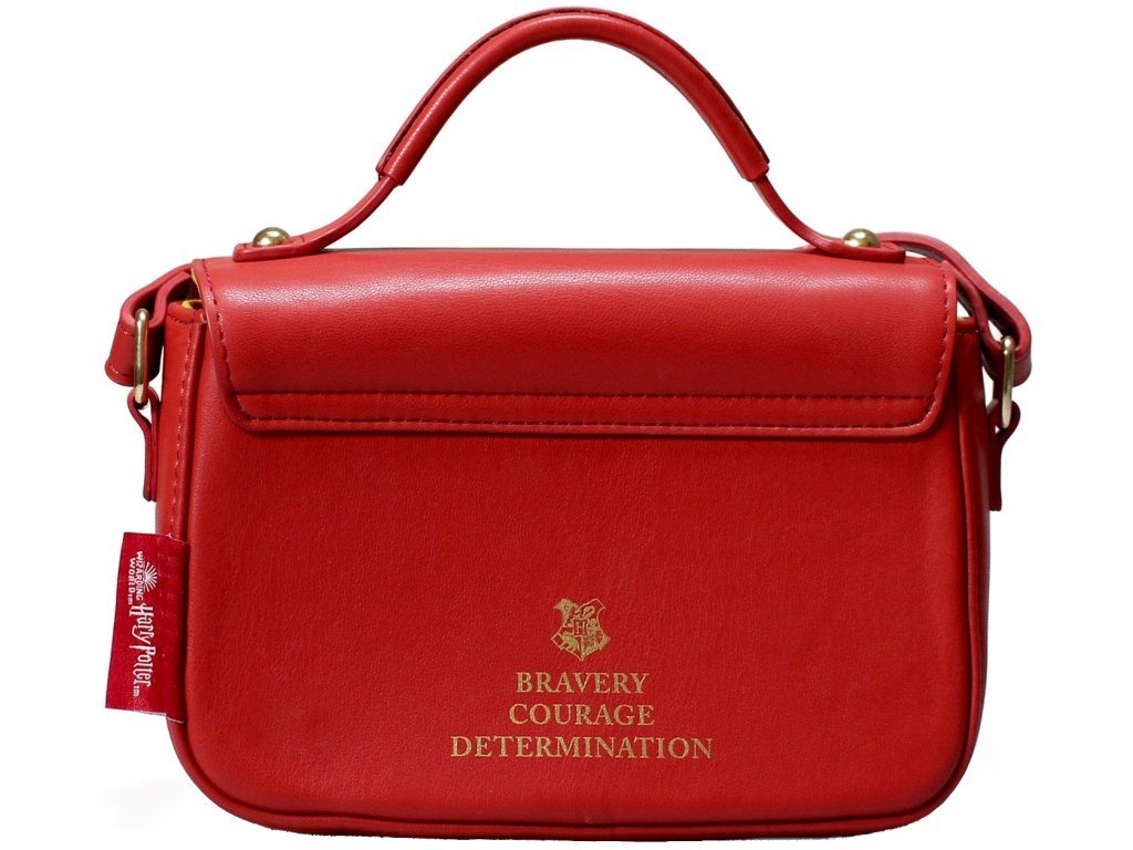 Červená dámská kabelka s popruhem a uchem pro nošení v ruce s nápisem "Proud Gryffindor at Hogwarts School of Witchcraft & Wizardry" - Hrdý Nebelvír ve škole Čar a kouzel v Bradavicích.