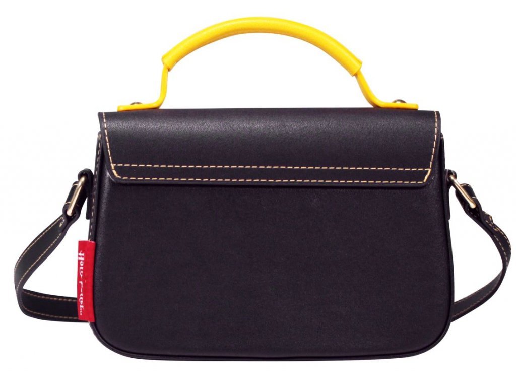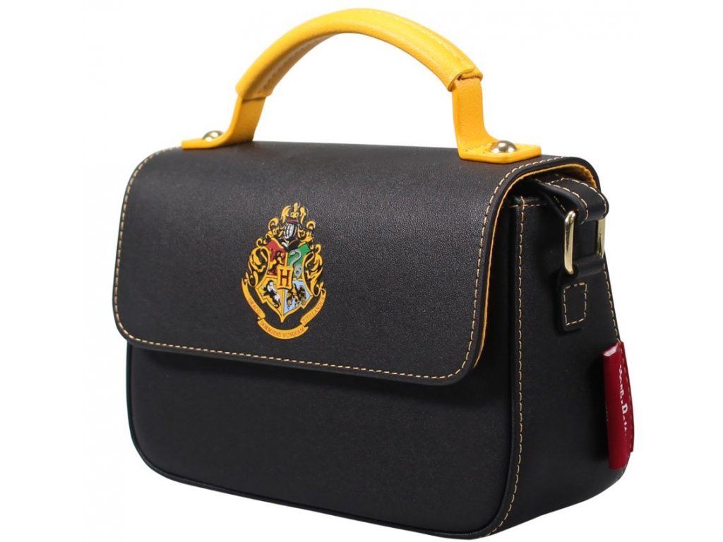 Černá dámská kabelka se žlutým uchem a dlouhým popruhem, zdobená logem a grafikou kouzelnické školy v Bradavicích.