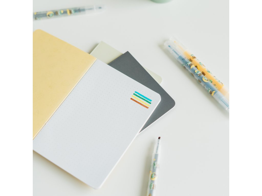 Obsahuje 3 sešity A6, 1 tužku s gumou, 2 kancelářské sponky s gumou, 1 balíček samolepících papírků, 1 pouzdro se 4 zvýrazňovači, 2 listy samolepek a 1 pero s gumou. Vše uvnitř PU a PVC sáčku se zipem.Doplňkové parametry