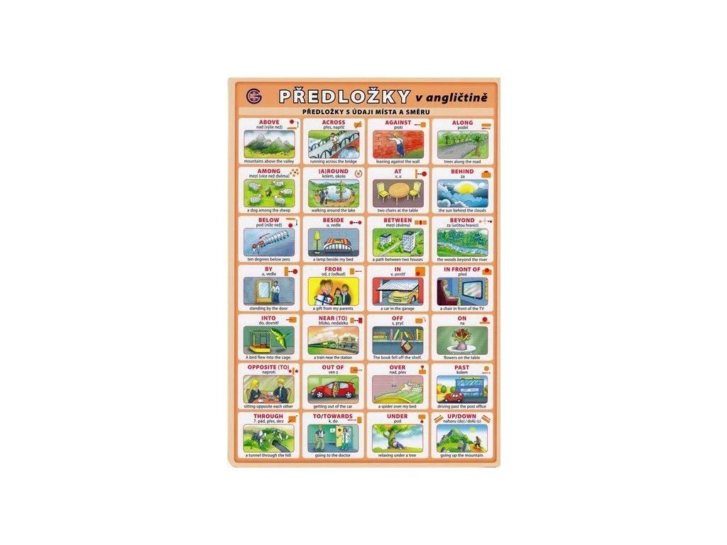 Přehledná a názorně ilustrovaná pomůcka zaměřená na předložky v angličtině. Nabízí anglické předložky s českým překladem a ukazuje jejich použití na ilustrovaných příkladech. Obsahuje přehled předložek vyjadřujících místo, směr i čas, včetně nejčastějších předložek jako at, on, in a základních předložkových vazeb.