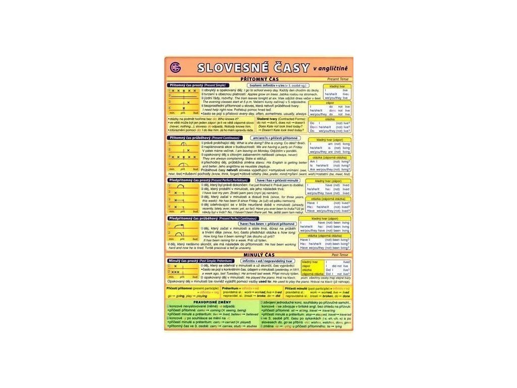 Přehledná a názorně zpracovaná gramatická pomůcka zaměřená na slovesné časy v angličtině. Nabízí ucelený přehled základních časů včetně jejich použití a praktických příkladů. Součástí jsou také přehledné tabulky tvoření časů, pravopisné změny při časování sloves a vysvětlení tvorby trpného rodu.