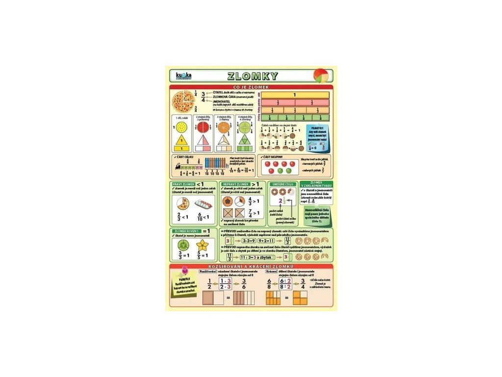 Přehledná a názorně ilustrovaná matematická pomůcka na téma zlomky. Obsahuje vysvětlení základních pojmů jako čitatel, jmenovatel a zlomek jako část celku, přehled rozdělení zlomků, postupy pro rozšiřování a krácení, porovnávání zlomků a typické matematické operace se zlomky. Tento přehled je zpracován tak, aby usnadnil pochopení látky a rychlou orientaci při učení.