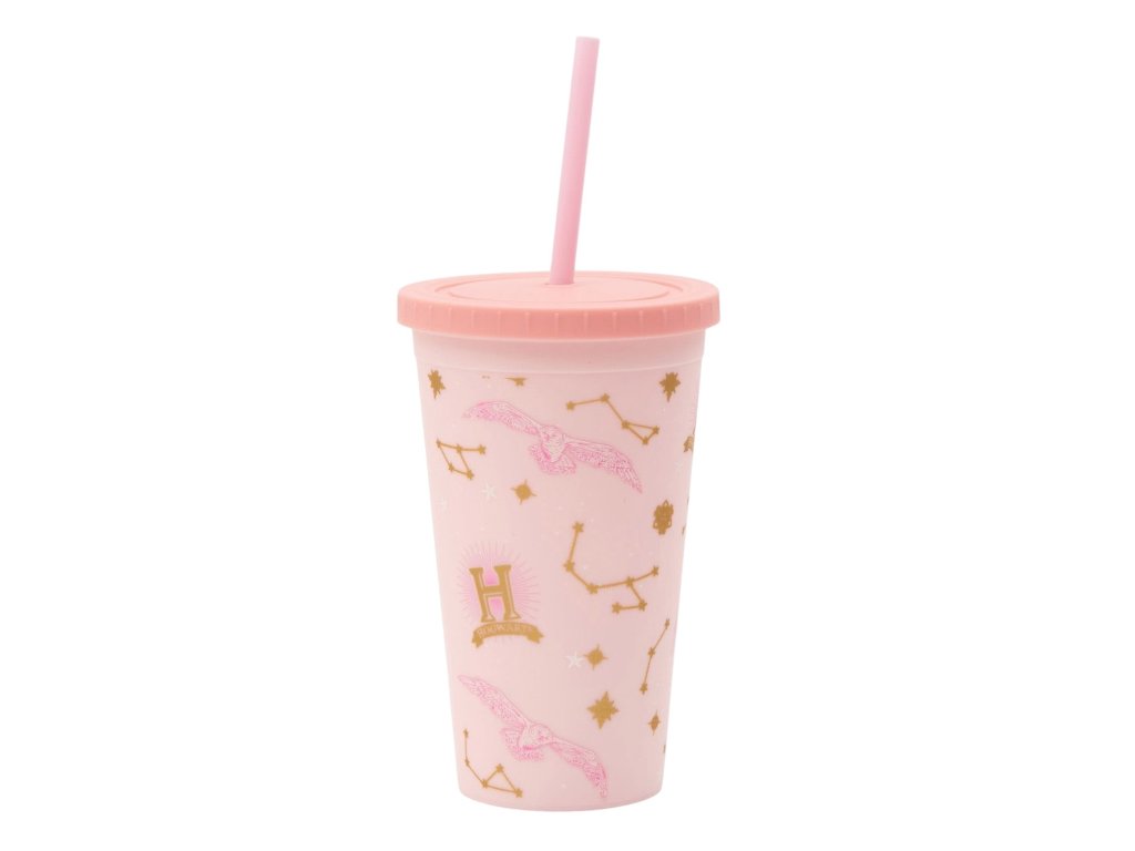 Růžový plastový kelímek s uzavíratelným víčkem a s brčkem, v designu hvězd, souhvězdí a sovy Hedviky.