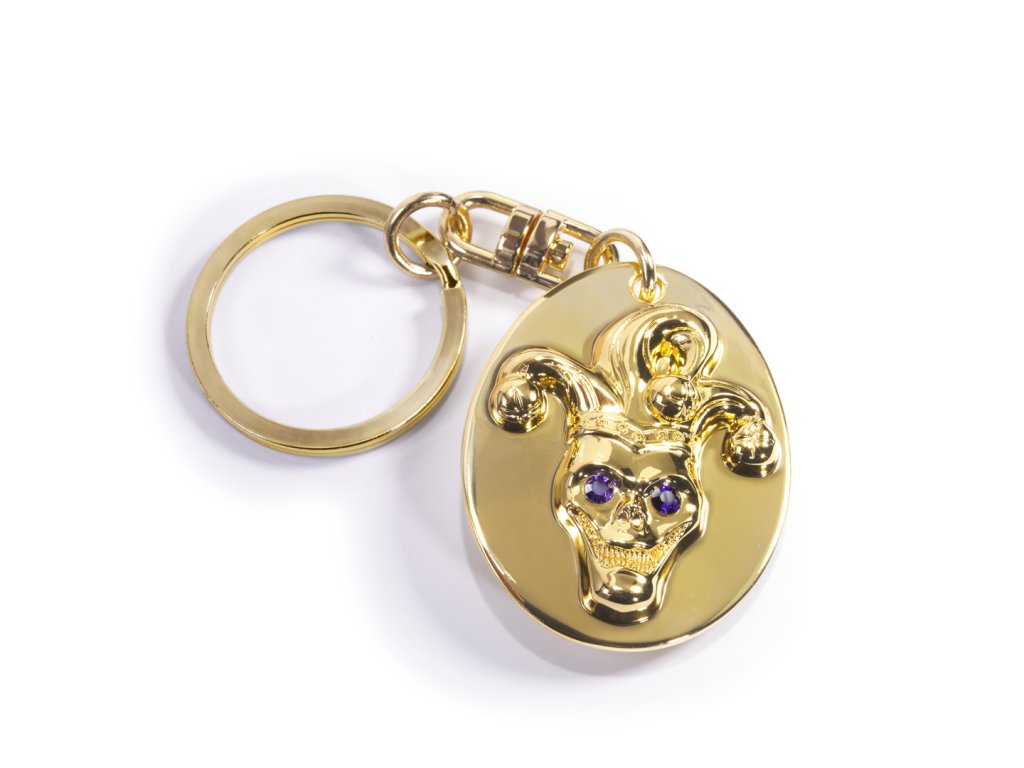 Zlatá kovová klíčenka s motivem Jokera. Materiál: kov, průměr: 3,3 cm
