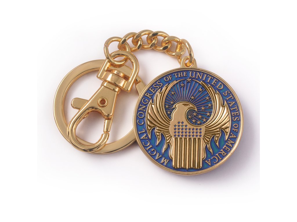 Kovová klíčenka s Ikonickým znakem Magického úřadu pro Severní Ameriku (MACUSA) zobrazující vlajku a orla bělohlavého. Klíčenka je ve zlaté barvě s modrými smaltovanými detaily a je dodávána v krabičce s motivem Fantastických zvířat.Doplňkové parametry