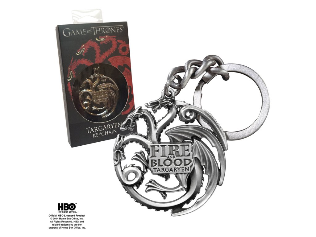 Kovová klíčenka z neleštěného kovu v podobě tříhlavého draka, který představuje rod Targaryenů.Doplňkové parametry