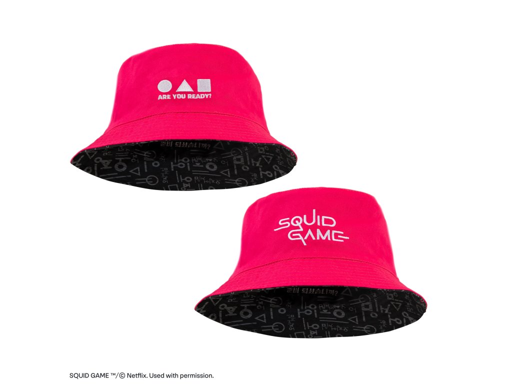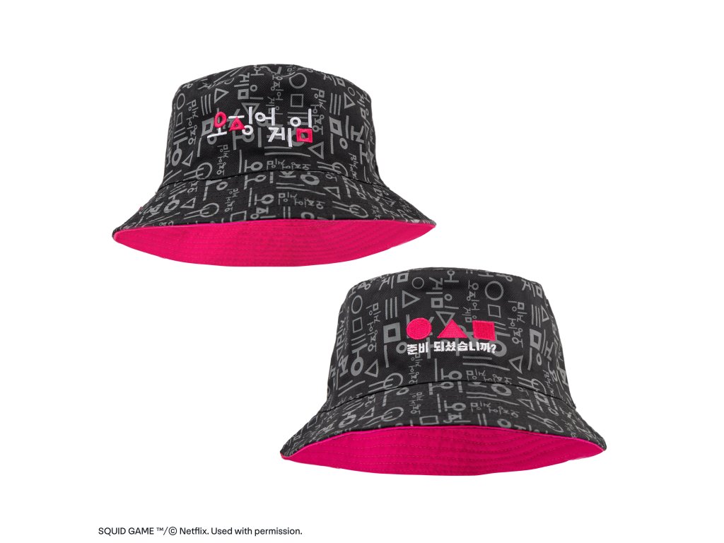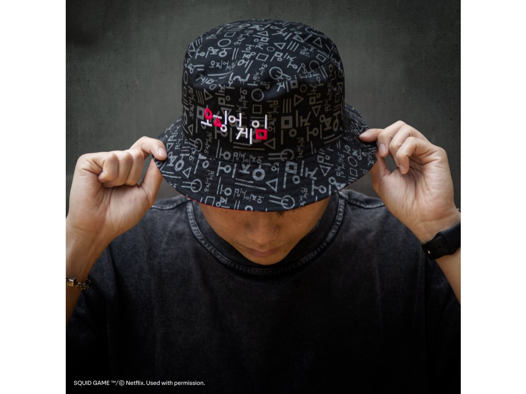 Oboustranný kloubouček Squid Game s nápisem seriálu v korejštině na jedné straně a v angličtině na druhé. Vyroben z pohodlné a odolné bavlny, ideální pro každodenní nošení, na pláž i na volný čas.