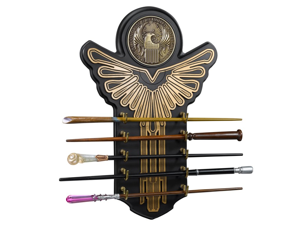 Elegantní kolekce replik pěti hůlek významných postav z Fantastických zvířat (Newt, Porpentina, Queenie, Seraphina a Graves), které jsou umístěny na ručně malovaném nástěnném displeji o rozměrech 42 x 27 cm a položených pod emblémem MACUSA (Magical Congress of the United States of America).