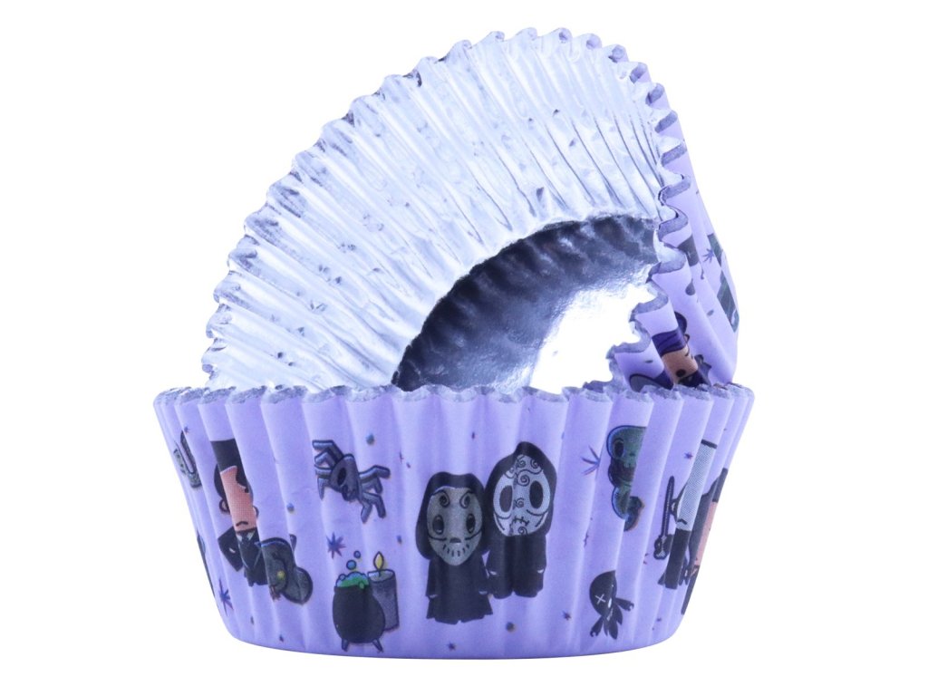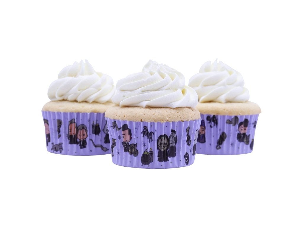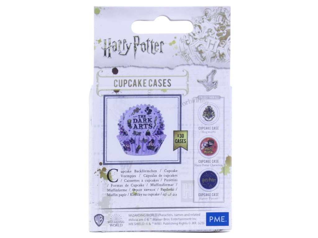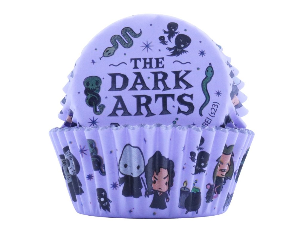 Vysoce kvalitní papírové košíčky na cupcaky potažené metalickou fólií, aby nedocházelo k prosakování mastnoty. Sada obsahuje celkem 30 kusů košíčků s motivem Dark Arts, tedy s ikonickým vyzobrazením temných postav a předmětů ze světa Harryho Pottera.