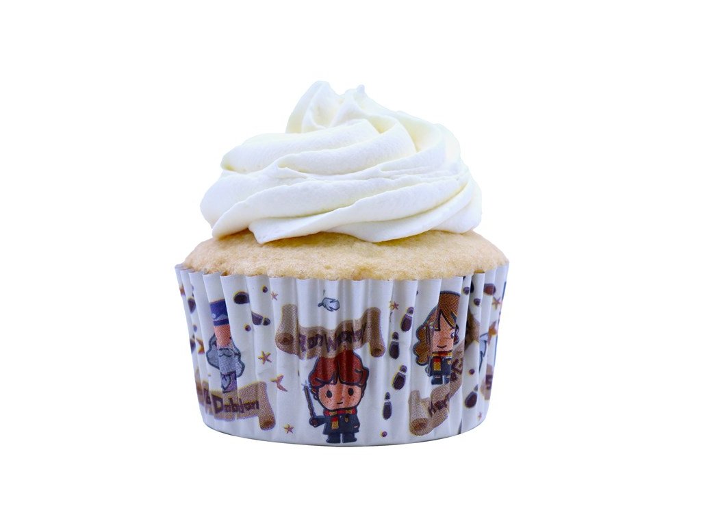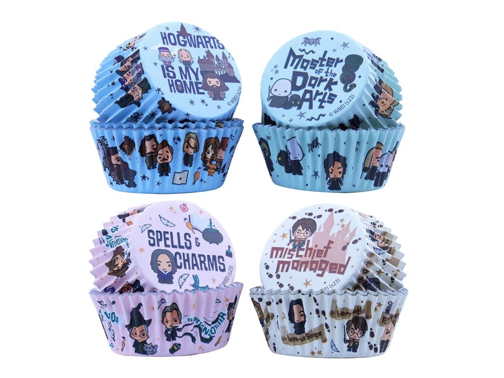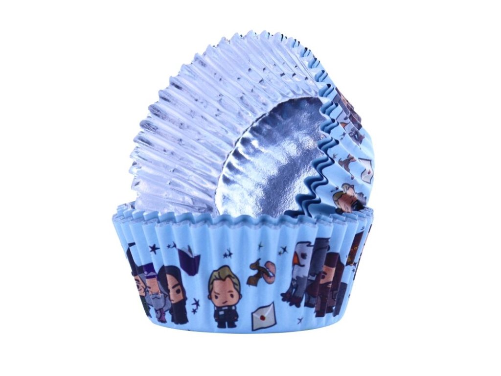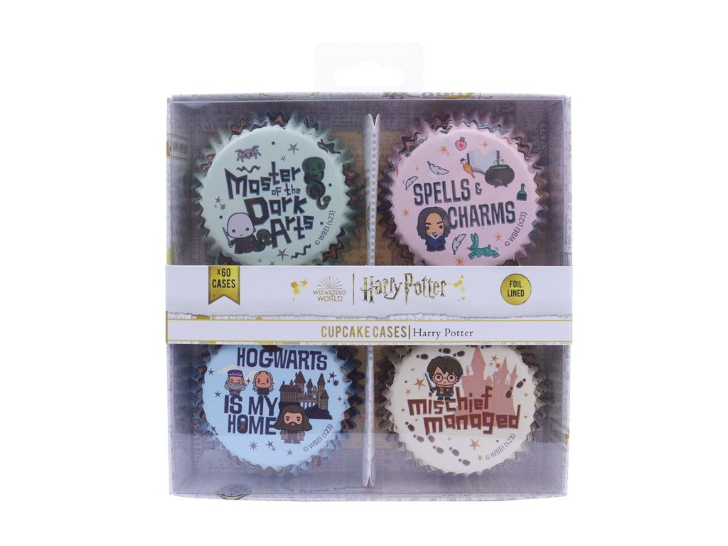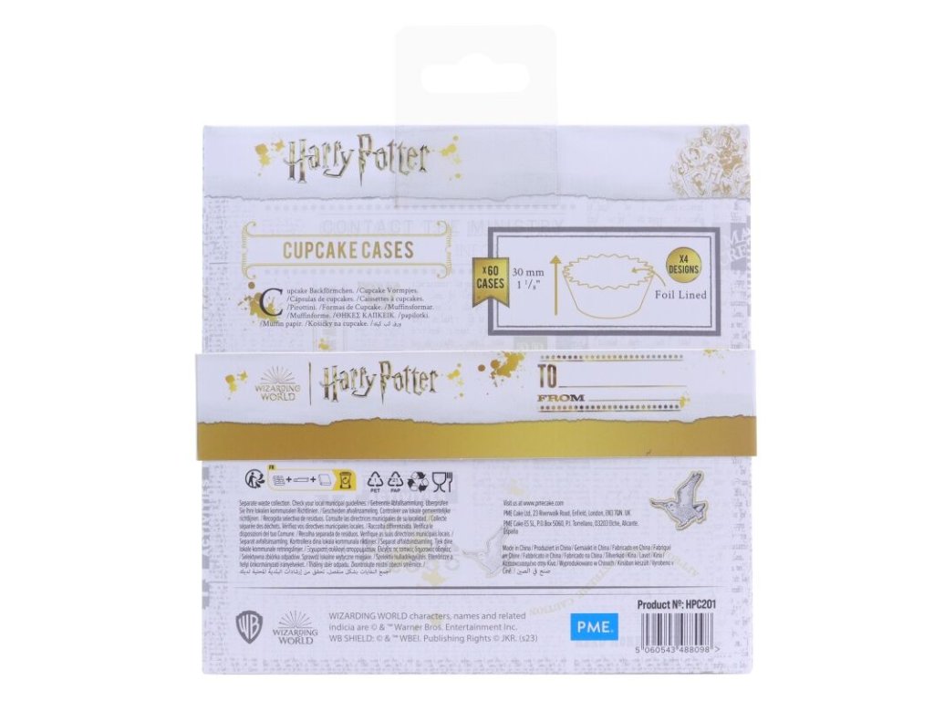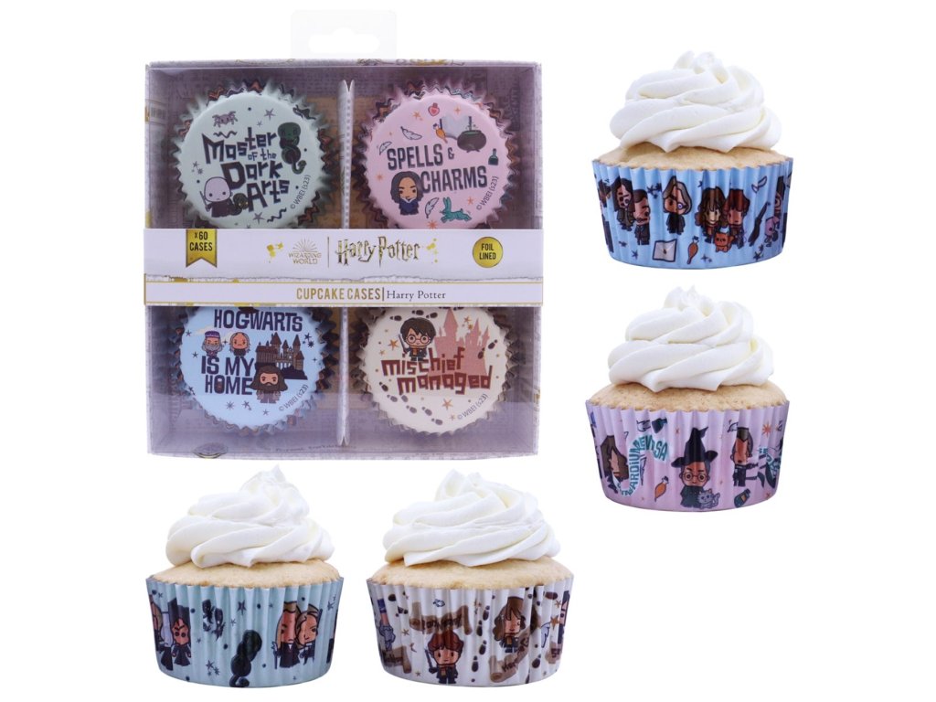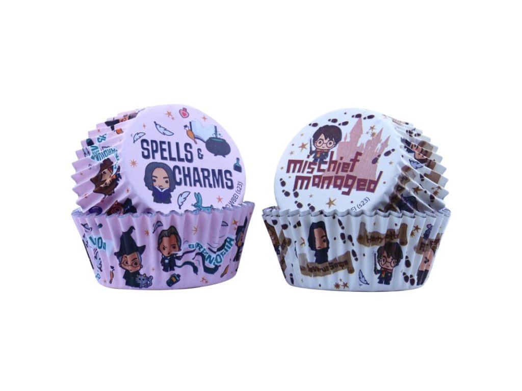 Vysoce kvalitní papírové košíčky na cupcaky potažené metalickou fólií, aby nedocházelo k prosakování mastnoty. Každá sada obsahuje 15 x 4 různých vzorů (celkem 60 kusů): Spell Done, Hogwarts is My Home, Spells and Charms a Master of Dark Arts.