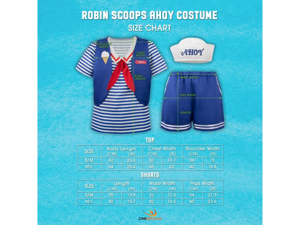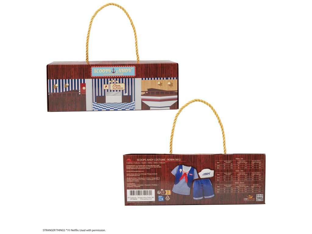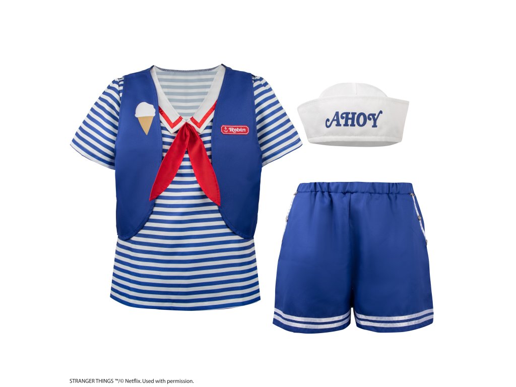 Vydejte se na cestu do 80. let s naším kostýmem Scoops Ahoy Robin inspirovaným vtipnou postavou z kultovního seriálu Stranger Things. Kostým obsahuje ikonické šortky Scoops Ahoy a pruhovaný modrobílý top zdobený červenobílým námořnickým límcem. Soupravu doplňuje vesta Scoops Ahoy s Robinovou červenou jmenovkou a nezbytná námořnická čepice "Ahoy", která vše završuje.