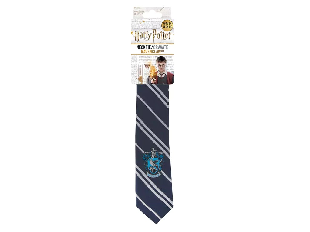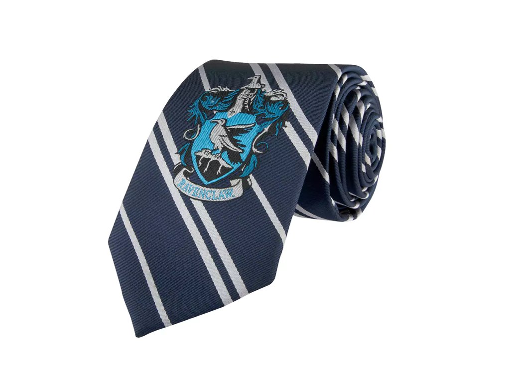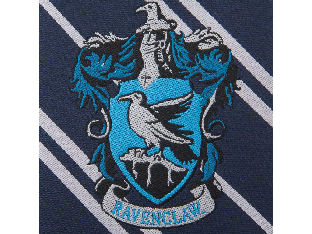 Stylová modrá kravata havraspárské koleje s erbem a nápisem Ravenclaw.
