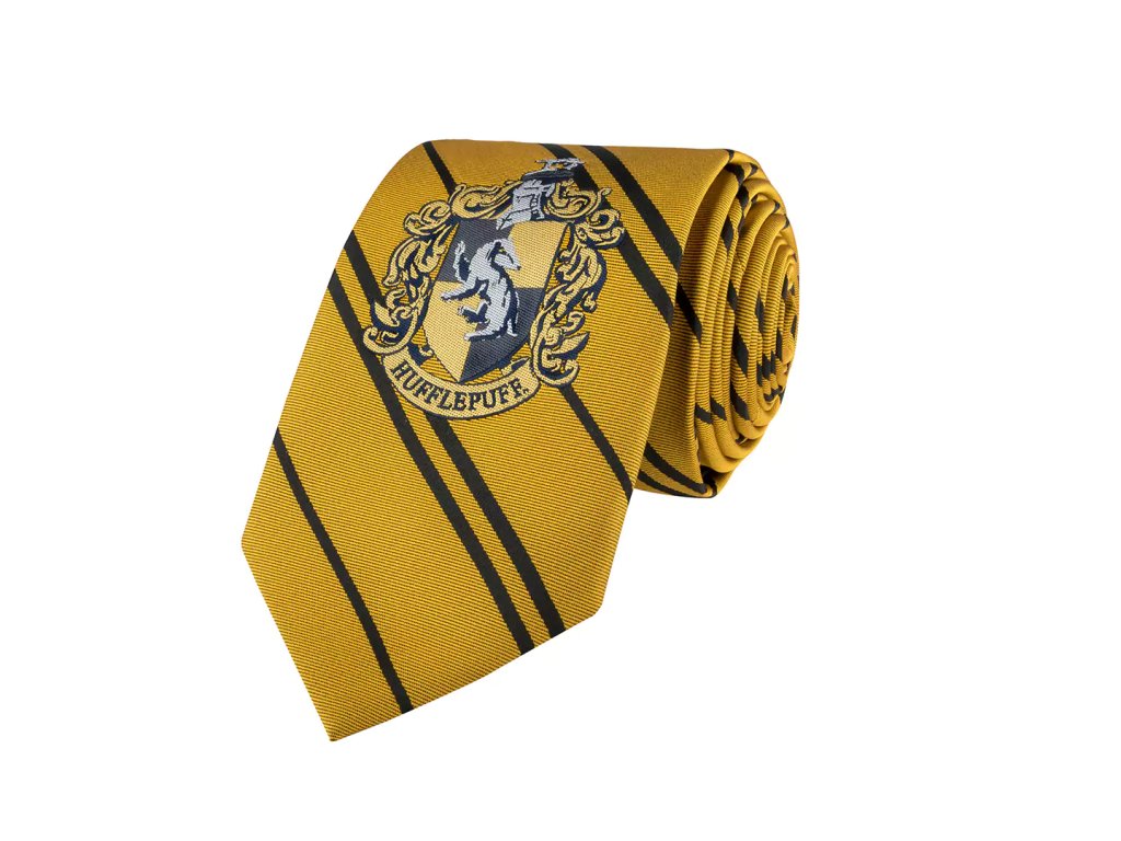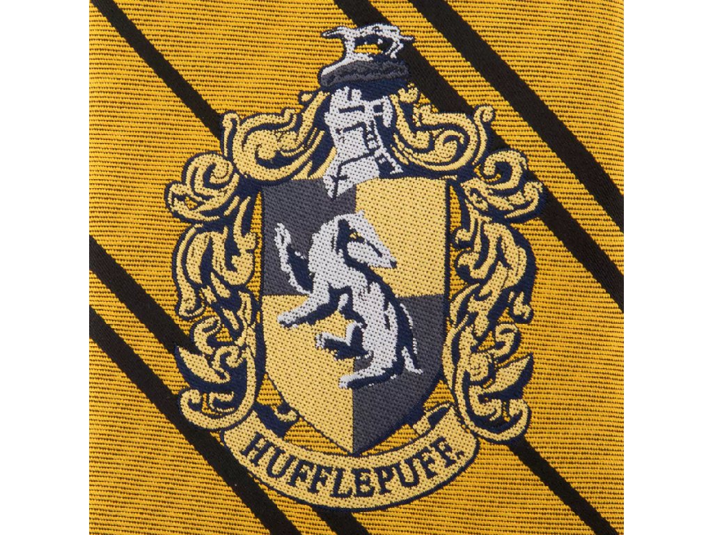 Stylová žlutá kravata mrzimorské koleje s erbem a nápisem Hufflepuff.