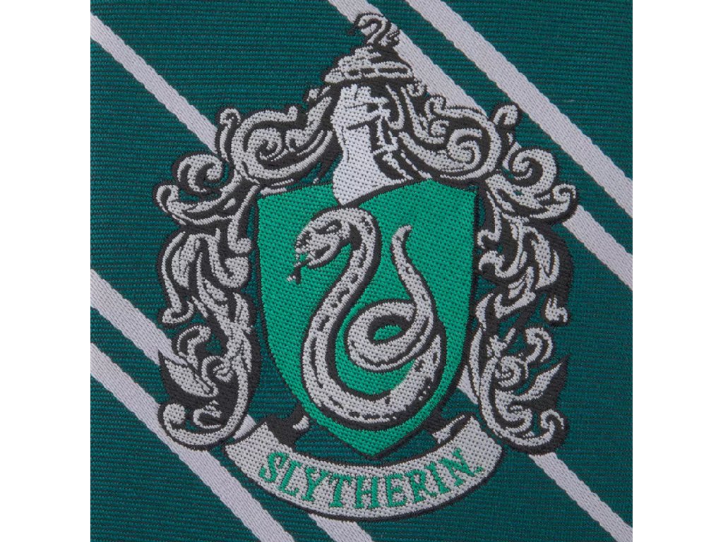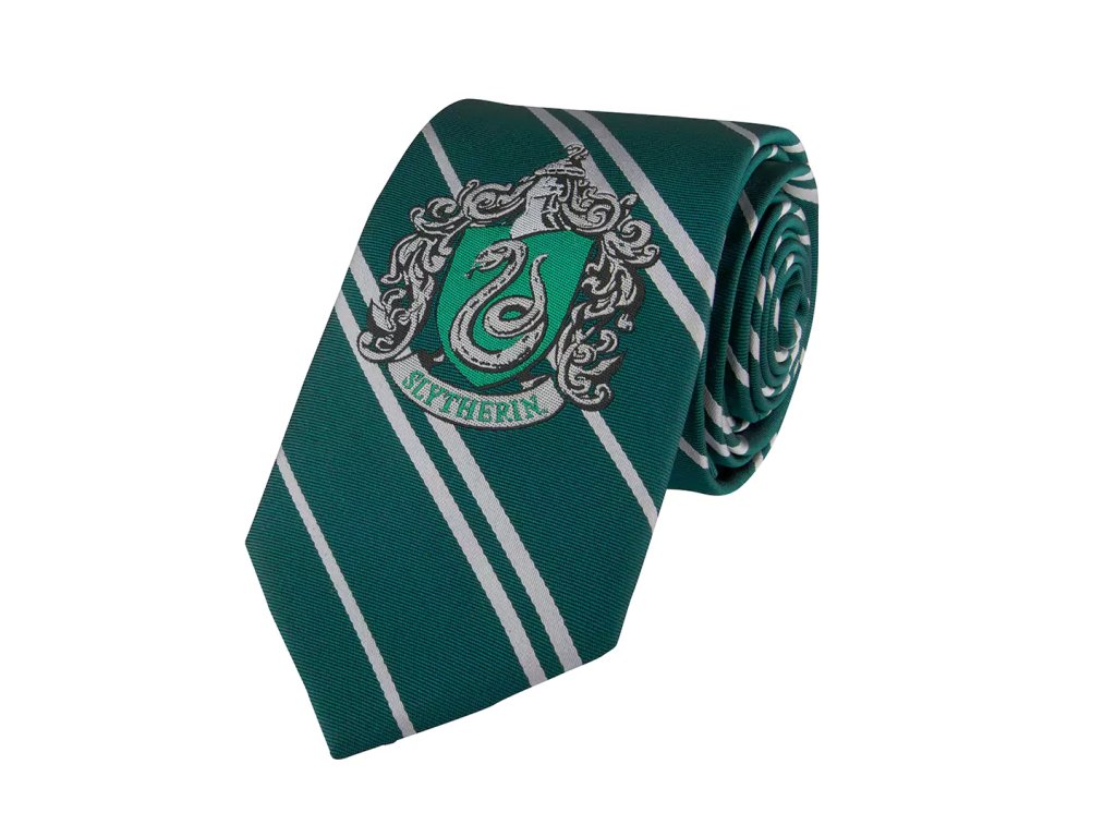 Stylová zelená kravata zmijozelské koleje s erbem a nápisem Slytherin.