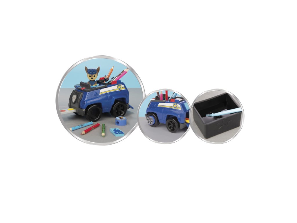 Autíčko Chase z Tlapkové Patroly jako praktický stojánek plný kreativních potřeb. Sada obsahuje štětec, razítko, 4× vodovou barvu, ořezávátko, gumu a 8× pastelku.Doplňkové parametry