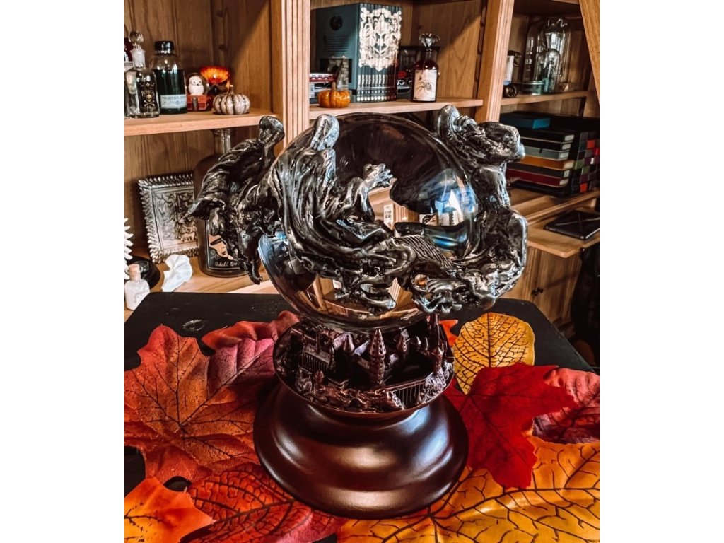 Nádherná křišťálová koule se vznášejícími se mozkomory nad bradavickou školou, kteří připomínají temnou atmosféru třetího dílu Harryho Pottera - Vězně z Azkabanu.