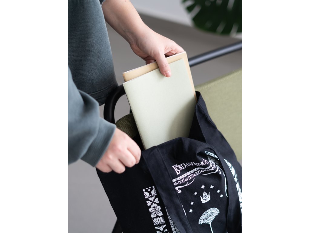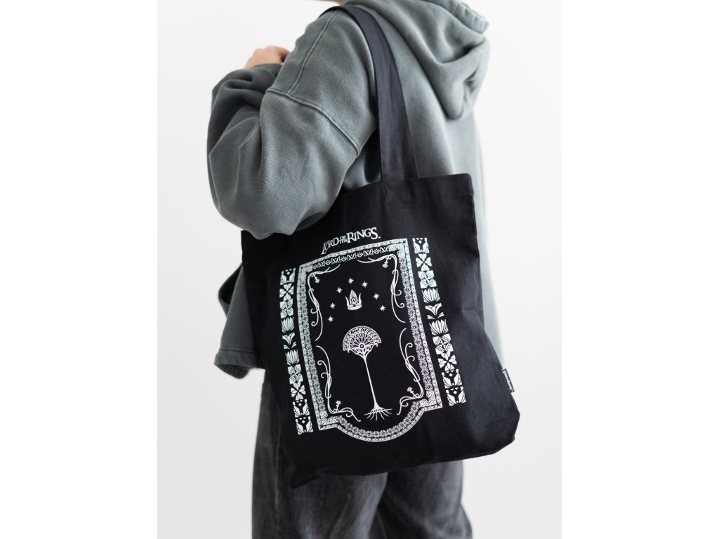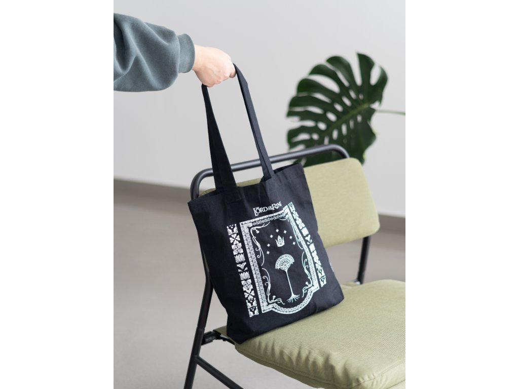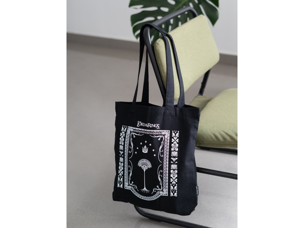 Stylová černá látková taška s motivem Brány do Morie inspirovaná filmovou trilogií Pán prstenů. Vyrobena z odolného textilu (100% bavlna), vhodná pro každodenní použití i jako doplněk pro fanoušky Středozemě. Taška má pevné popruhy pro pohodlné nošení a dostatečně prostorný vnitřek pro knihy, nákupy či drobnosti.