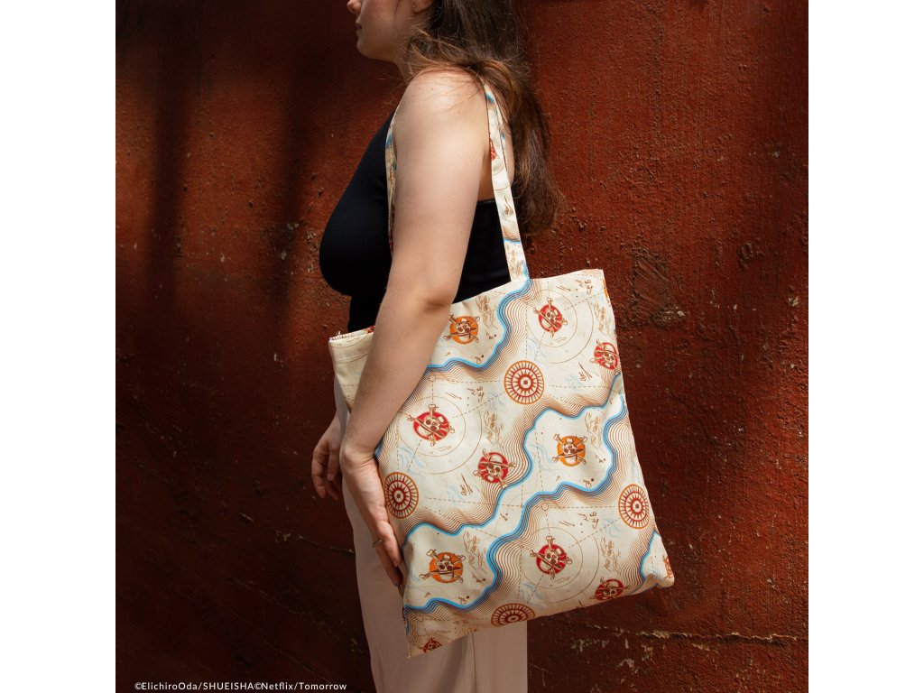 Tato taška, inspirovaná mapou, která ukazuje na Grand Line, má béžové pozadí a modrý nádech, který lemuje vodní hladinu podél mapy. Tato prostorná taška je ideální pro přenášení vašich každodenních nezbytností.