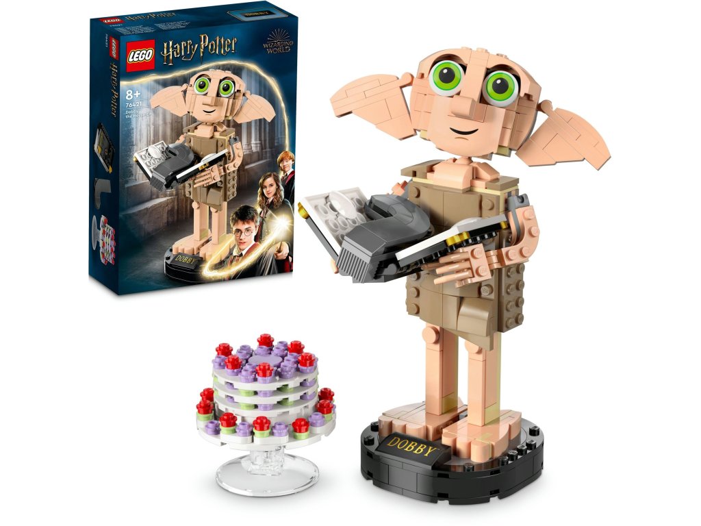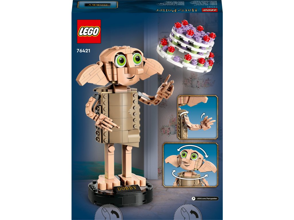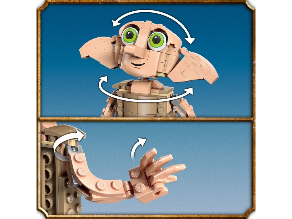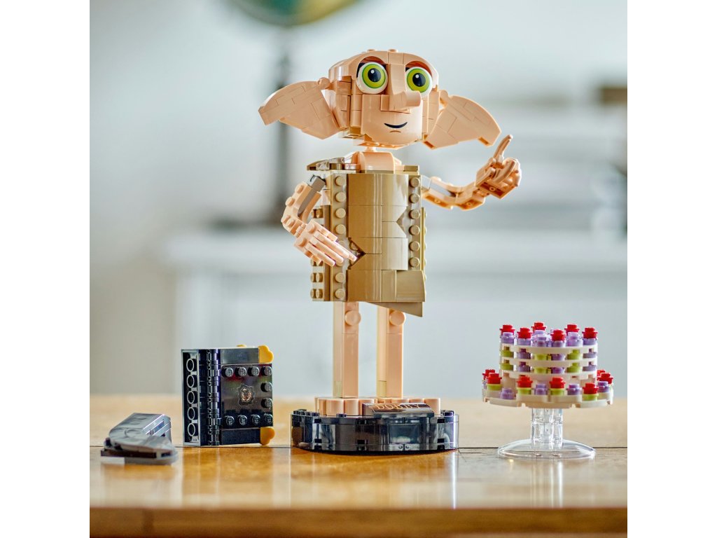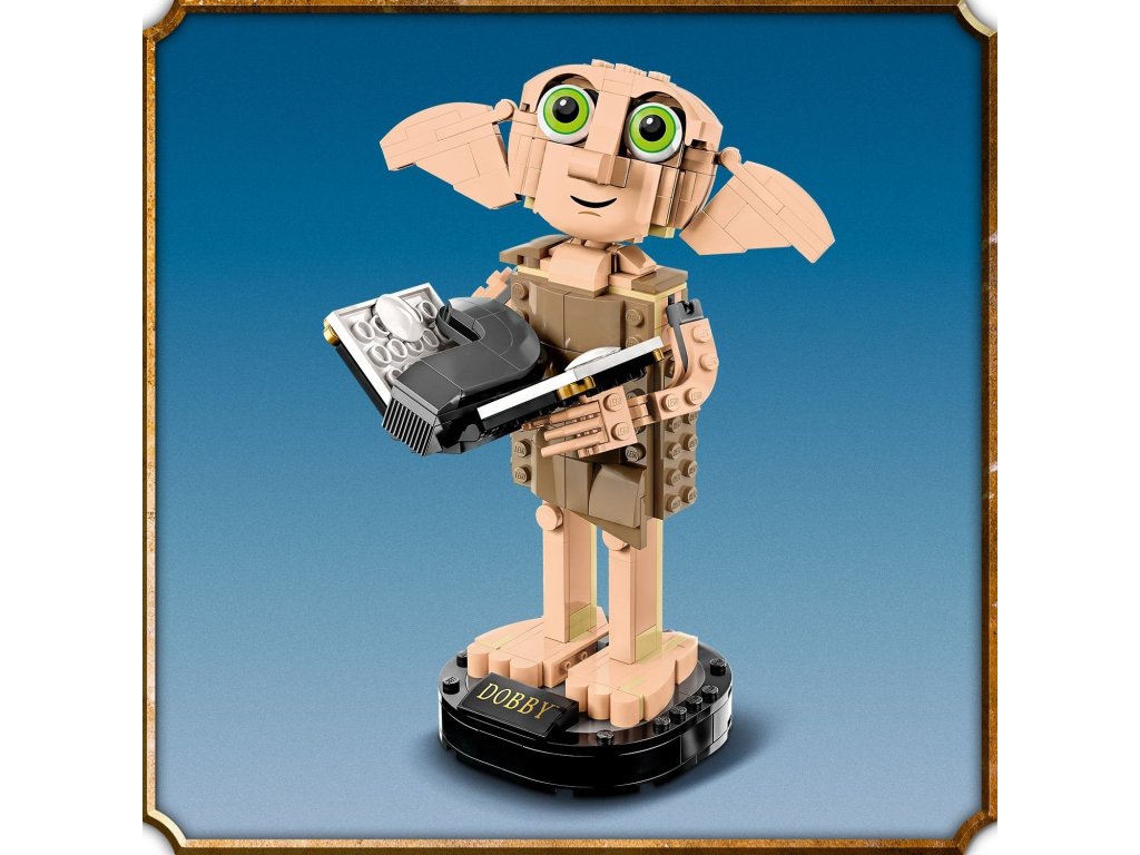 Prožijte znovu kouzelné scény ze světa Harryho Pottera a postavte si zcela první model domácího skřítka Dobbyho z kostek LEGO®! Umístěte Dobbyho na podstavec na vystavení s cedulkou. Nakloňte mu hlavu tak, aby se na vás dívaly jeho velké oči. Upravte jeho paže a prsty, aby mohl držet deník Toma Raddla s ponožkou Harryho Pottera uvnitř a poslat dort tety Petunie do vzduchu. Tento kouzelný model si všichni přímo zamilují!
