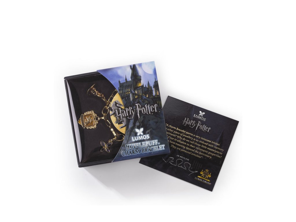 Tento speciální náramek se zlatým pokovem obsahuje tři exkluzivní přívěsky: erb koleje Mrzimor, Moudrý klobouk a logo nadace Lumos. Délka náramku je přibližně 21 cm. „Náramek s přívěsky se zdá být jen nevinným šperkem. Jaký jiný klenot je však tolik prodchnut pamětí a citem? Proč bychom ty malé mistrovské kousky nazývali přívěsky, kdyby to nebyla narážka na jejich magické vlastnosti? Mají význam, který přesahuje prostou hodnotu. Jsou to osobní amulety.“ – J. K. Rowlingová „Lumos je kouzlo, které jsem vytvořila v Harrym Potterovi. Přináší světlo na zoufale temná a děsivá místa. A přesně to děláme v Lumosu: pomáháme osamoceným dětem, na které svět zapomněl. Chceme, aby všichni především pochopili problém opuštěných dětí a pak společně hledali cestu, jak ho vyřešit.“ – J. K. Rowlingová, zakladatelka a prezidentka nadace Lumos Nejméně 15 % doporučené maloobchodní ceny náramku bude odvedeno nadaci Lumos Foundation, neziskové organizaci založené J. K. Rowlingovou a registrované v Anglii a Walesu pod číslem charity 1112575.Doplňkové parametry