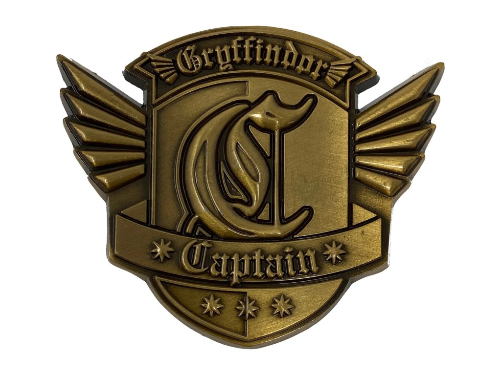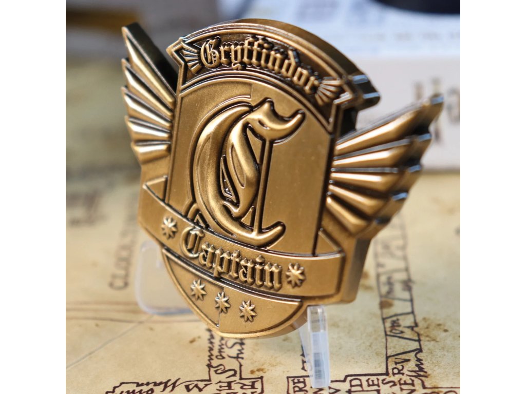 Sběratelský medailon v bronzové barvě, na kterém je vyobrazen symbol kapitána famfrpálového kolejního týmu Nebelvír.