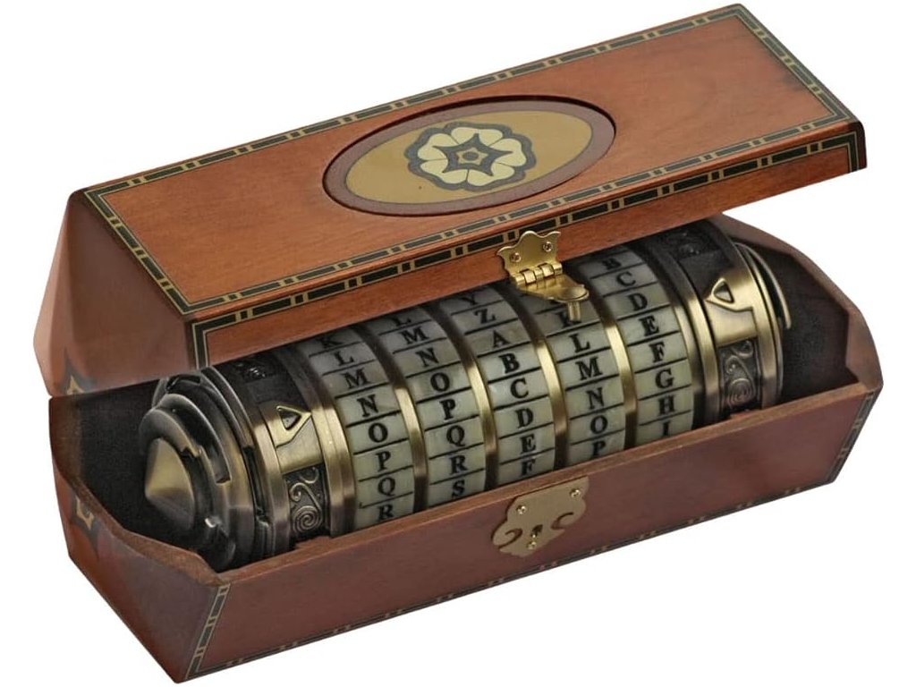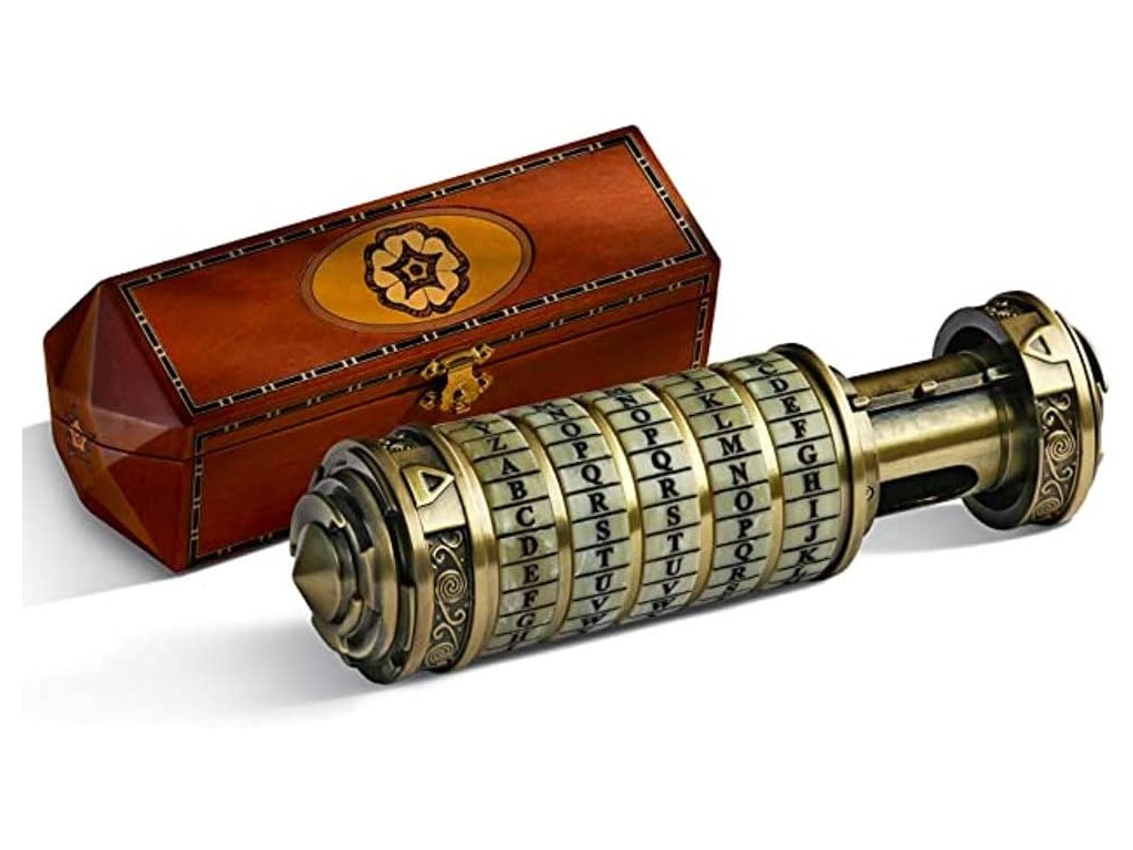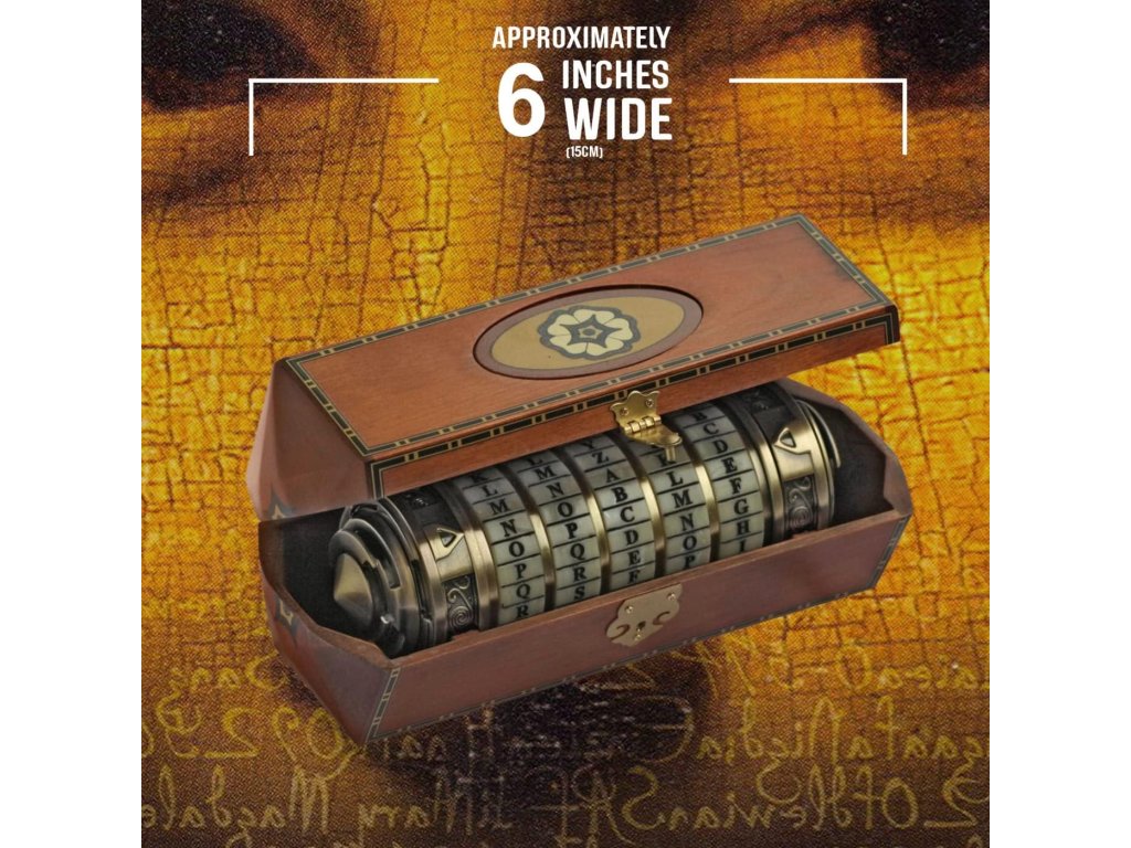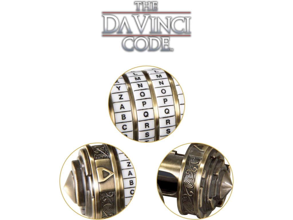 Detailní funkční model Cryptexu z filmu Šifra mistra Leonarda (2006), odlitý s pozlacenou povrchovou úpravou. Otevírá se heslem z filmu, pokud si ho nepřejete změnit na svůj vlastní tajný kód. Skrytá přihrádka měří 12,7 cm x 2,5 cm a má celkovou délku 15 cm.