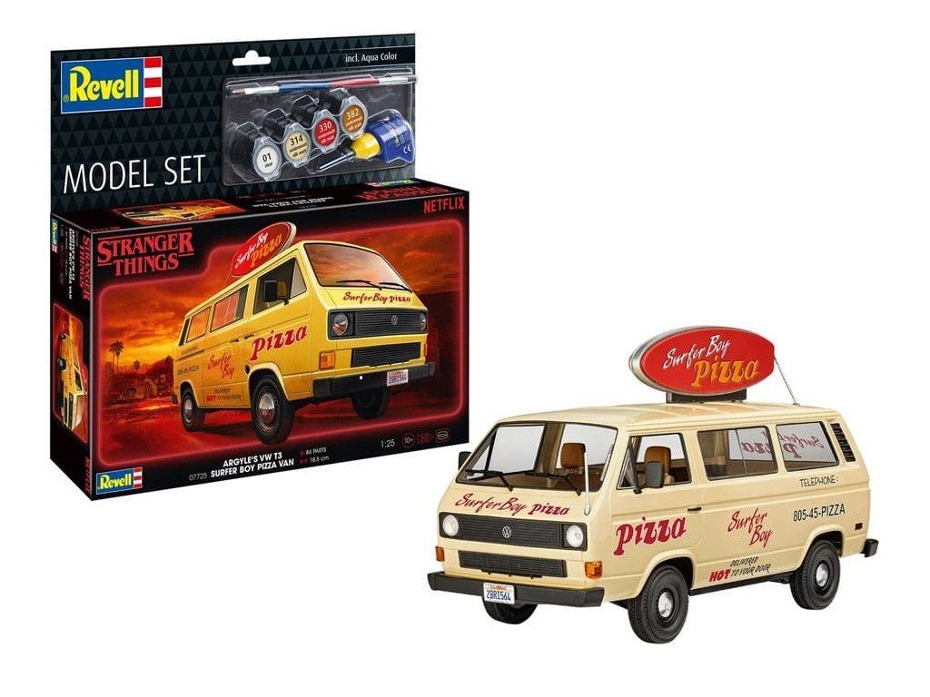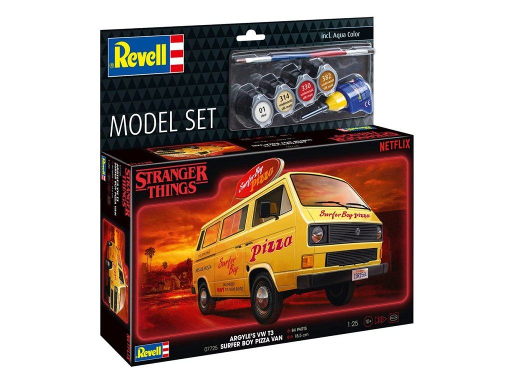 Součástí sady jsou základní barvy, lepidlo a štětec. VW T3 s potiskem sloganu "Surfer Boy" je známý ze čtvrté série "Stranger Things" a je k dispozici jako modelová sada pro začátečníky.