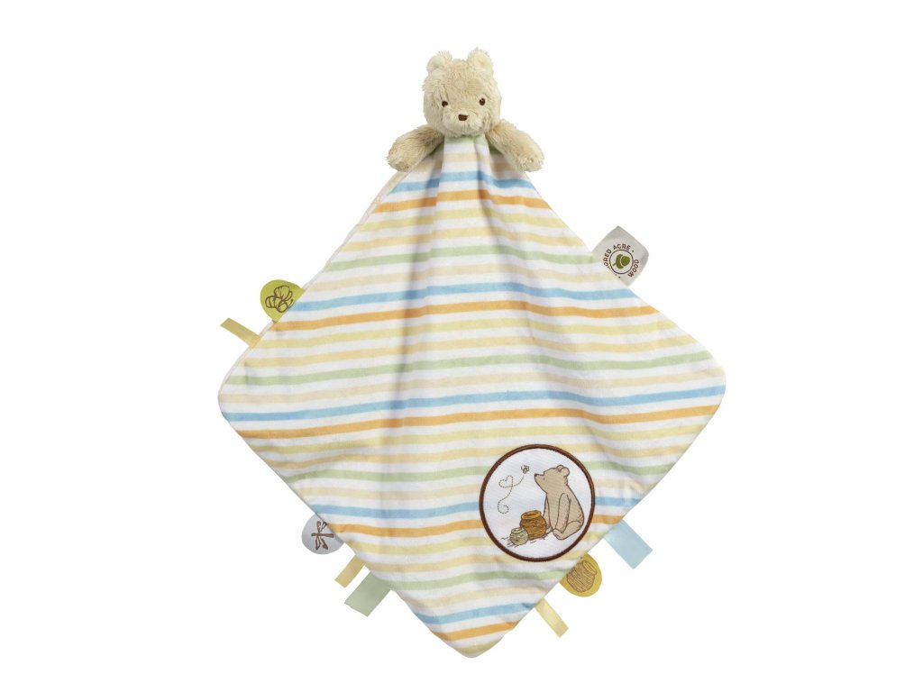 Tato měkká deka s motivem Medvídka Pú, inspirovaná slavnou postavou, se bude dětem líbit při mazlení s touto měkkou přikrývkou s Medvídkem Pú, ať už při pohádkách nebo před spaním. Snadno se drží a je vyrobena s vývojovými prvky, které podporují interakci. Vzor na zadní straně pomůže soustředit dětský pohled, textury a ozdoby s tematickými ilustracemi, včetně hrnku s medem, včely a motýla, podpoří smyslové hry.