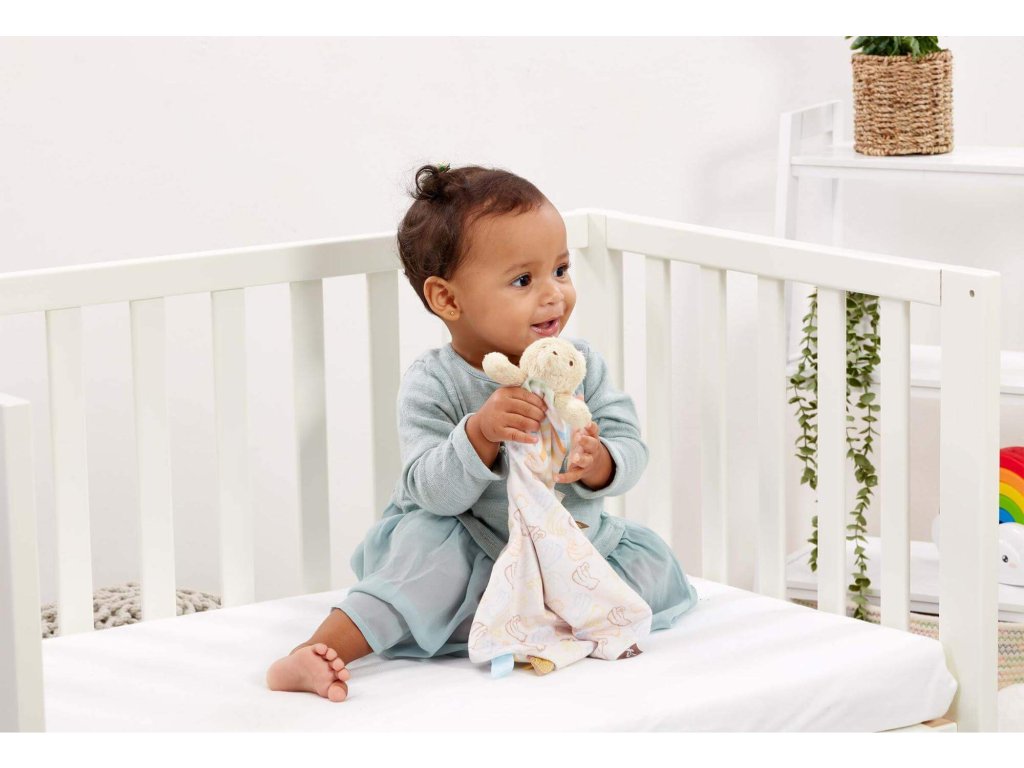 Tato dečka, kterou lze prát v ruce, je vhodná od narození a je perfektním mazlivým prvním společníkem pro vaše dítě.