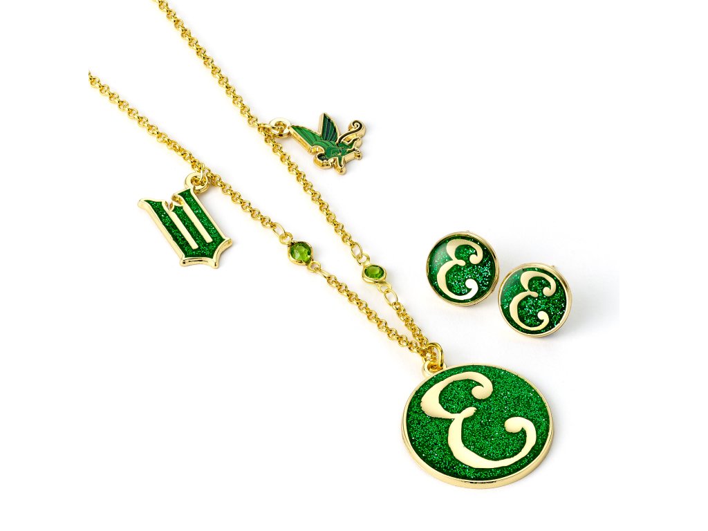 Sada náhrdelníku a náušnic inspirovaná nechvalně známou Elphabou, zlou čarodějnicí ze Západu. Zlatý řetízek o délce 60 cm je zdoben třpytivými zelenými krystaly a přívěsky s létajícími opicemi a je osazen zeleným smaltovaným přívěskem s iniciálou E. Vše je doplněno odpovídajícími náušnicemi. Dodáváno ve výrazné dárkové krabičce. Vhodné od 14 let.Buďte první, kdo napíše příspěvek k této položce.