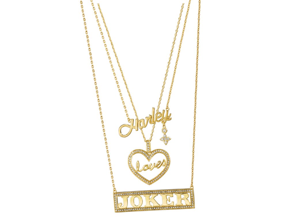 Sada šperků s motivem Harley Quinn s nápisy „Harley“, „Loves“ a „Joker“, pozlacená a osázená kamínky.