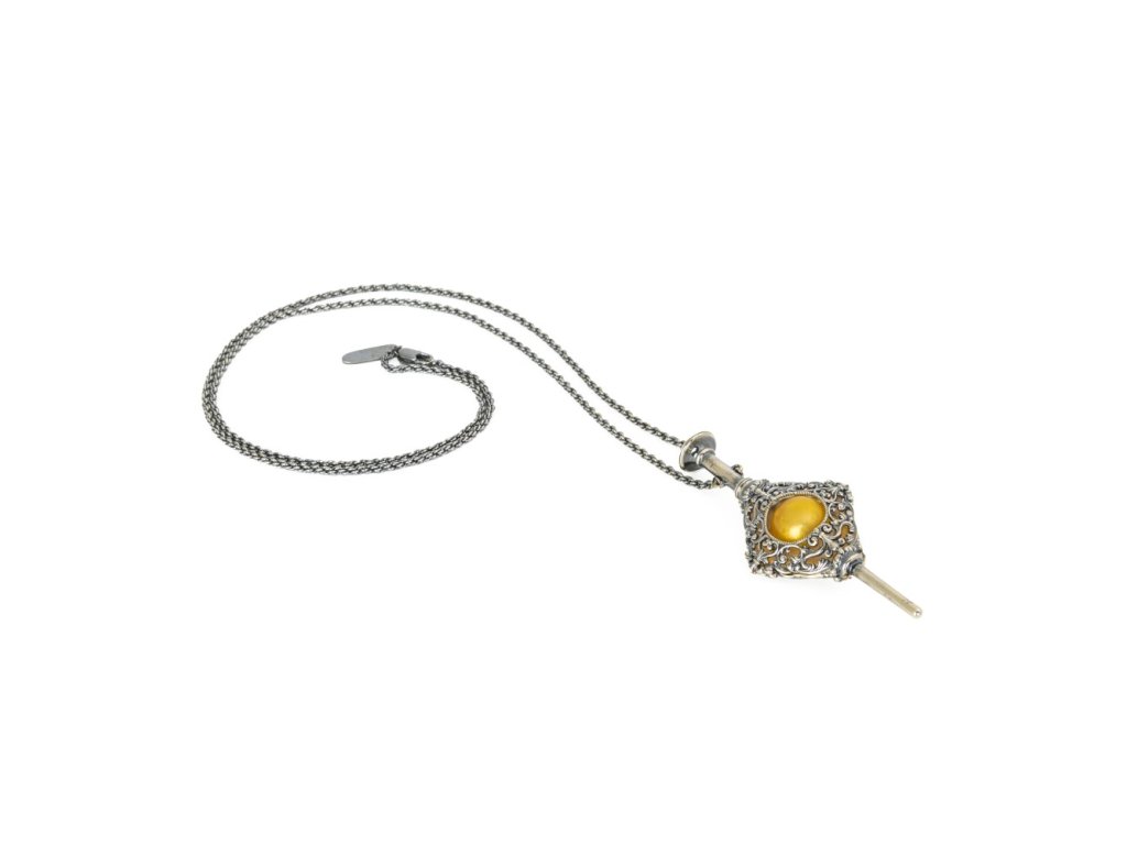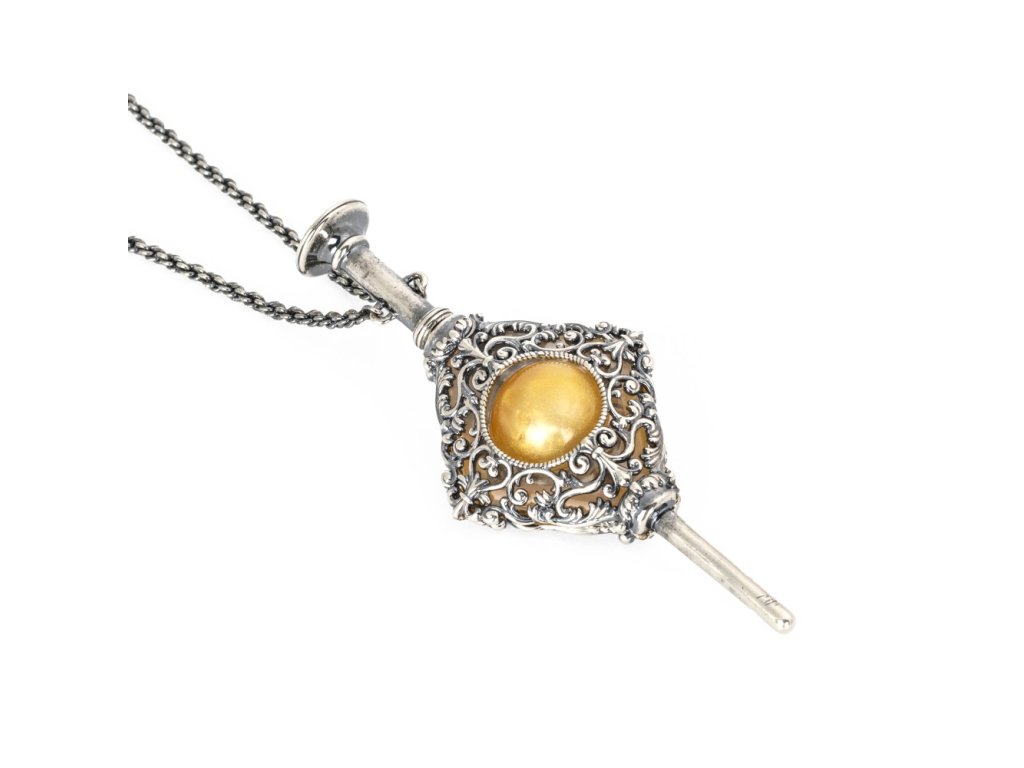 Stříbřená povrchová úprava dává přívěsku elegantní vzhled a umožňuje, aby si zachoval výraznost i při každodenním nošení. Přiložený řetízek o délce ~ 66 cm umožňuje pohodlné nošení — ať už jako náhrdelník či zavěšený jako dekorativní prvek.