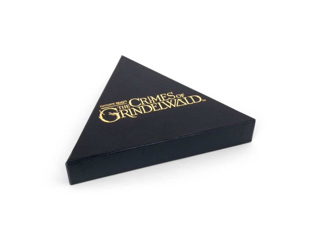 Elegantní dárková krabička ve tvaru Relikvií smrti přidává hodnotu — přívěsek tak nevynikne jen jako šperk, ale i jako sběratelský artefakt připravený k vystavení.