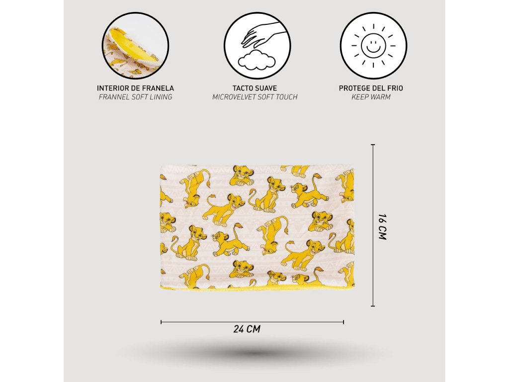 Nákrčník Lví Král je stylový a praktický doplněk pro malé fanoušky oblíbeného lva. Poskytuje teplo a pohodlí, a zároveň ukazuje jejich hrdinského ducha při každodenních dobrodružstvích.Doplňkové parametry