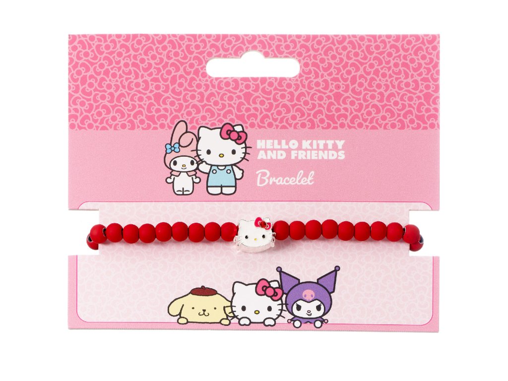 Délkově nastavitelný náramek Hello Kitty zdobený matnými červenými korálky a roztomilým perleťovým smaltovaným přívěskem. Pohodlně padne na zápěstí od 17 cm do 21 cm a je ideální pro fanynky od 14 let.Doplňkové parametry