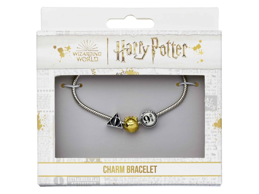 Elegantní postříbřený náramek s korálky, které představují Relikvie smrti, Zlatonku a Nástupiště 9 a 3/4, tři z nejznámějších symbolů ze série Harry Potter.