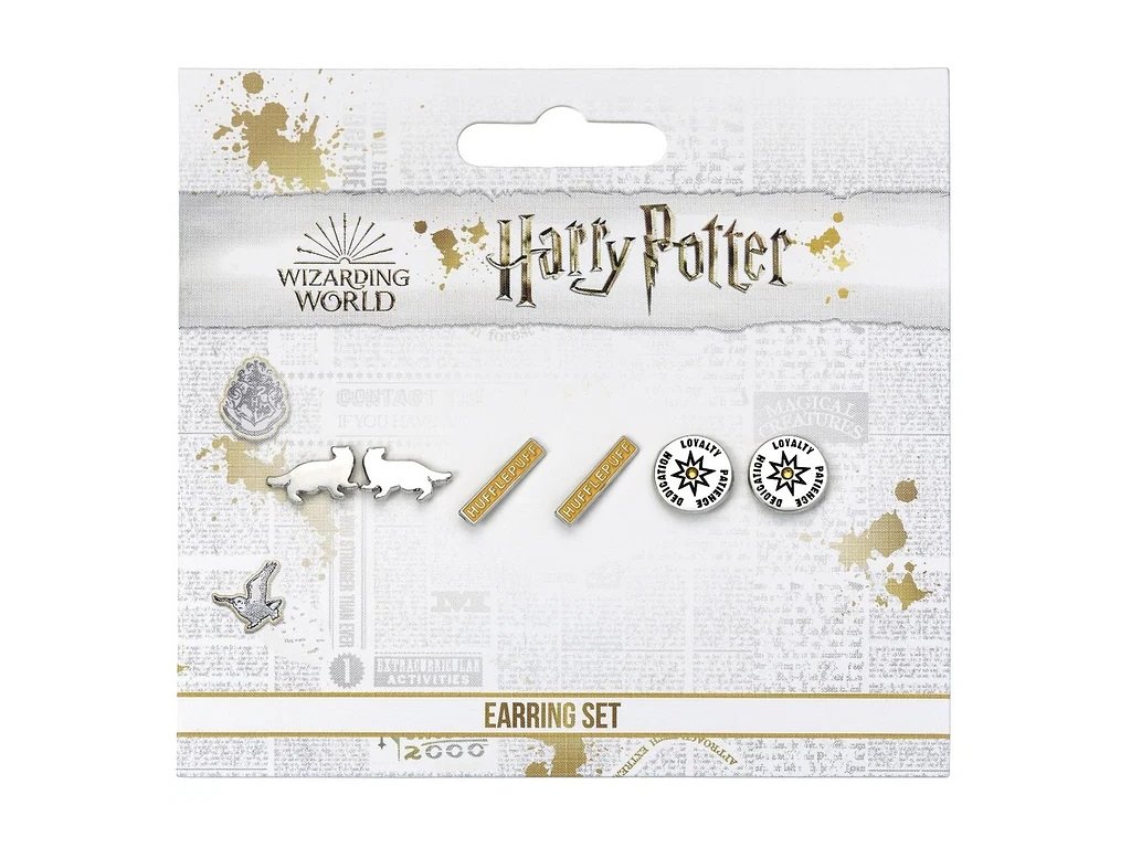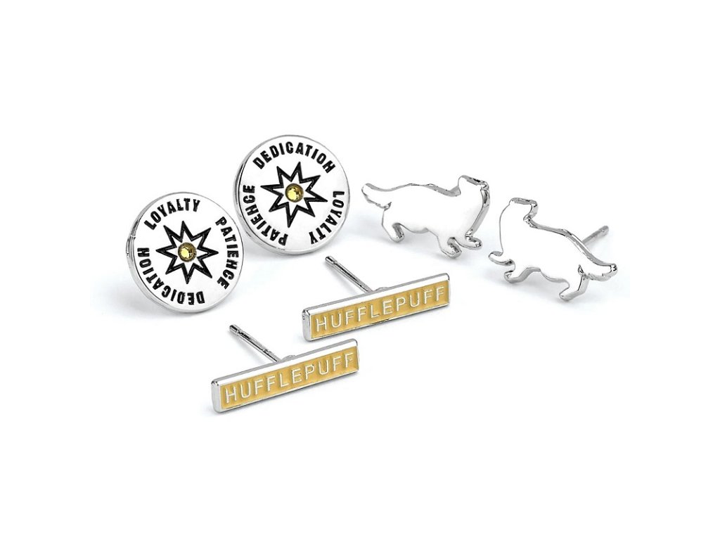 Sada postříbřených náušnic pro fanynky mrzimorské koleje. Tři páry pecek, které lze libovolně kombinovat - vyobrazují název koleje, dále kolejního maskota a v neposlední řadě trojici kolejních vlastností. Skvělé jako dárek ze světa Harryho Pottera.