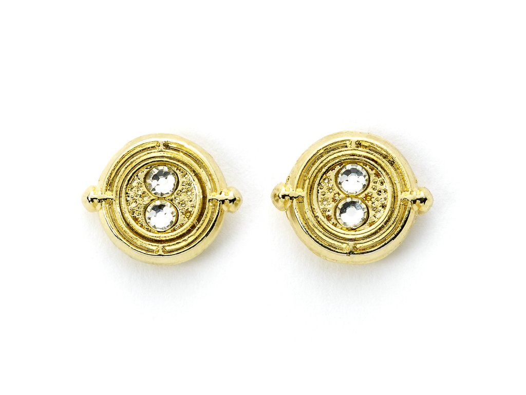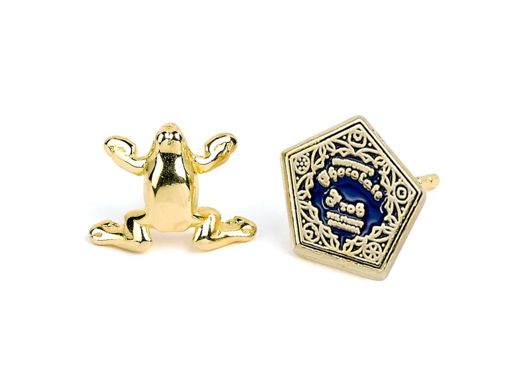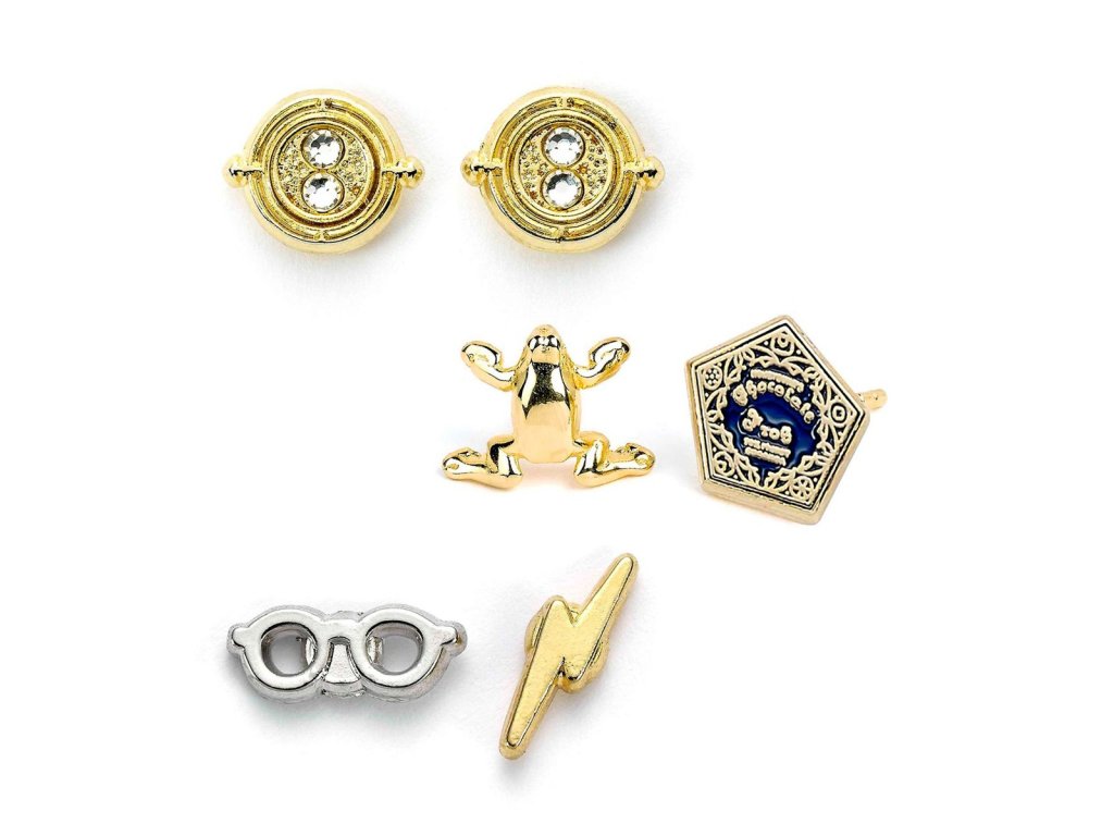 Sada postříbřených náušnic - Obraceč času, Čokoládová žabka, Brýle a blesk. Potěší každou menší i větší fanynku Harryho Pottera.