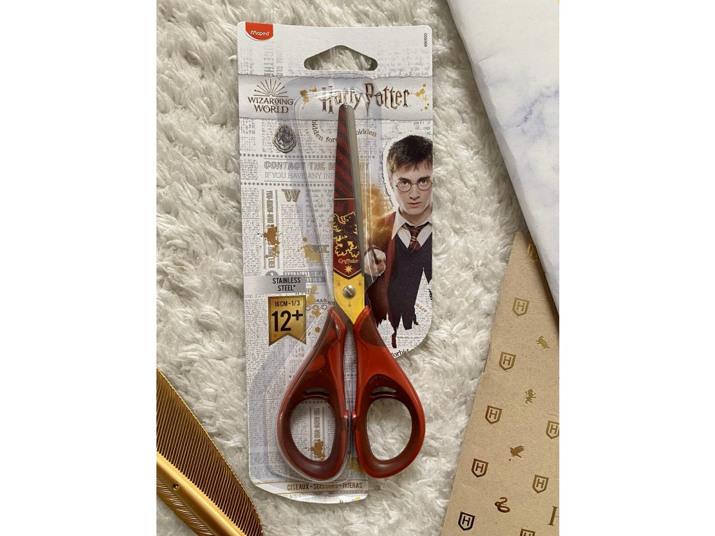 Nůžky pro začátečníky s atraktivním motivem Harryho Pottera, mají měkké symetrické rukojeti, zaoblené špičky, dekorované čepele z broušené nerezové oceli.
