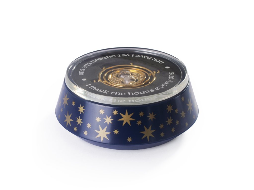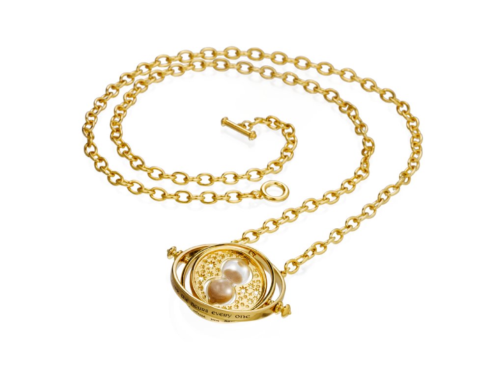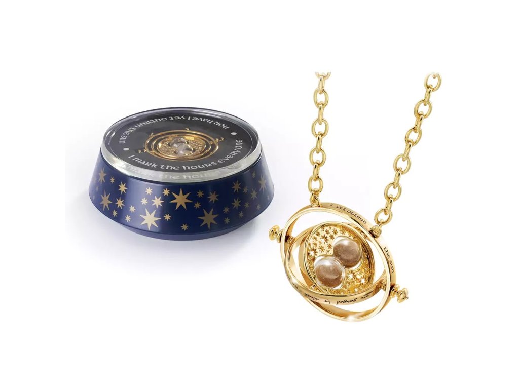 Autentická replika Hermionina obraceče času. Uprostřed jsou funkční miniaturní přesýpací hodiny s vnitřními rotujícími kroužky. Měří 5,5 cm v průměru s řetízkem o délce 76 cm. Je pozlacený 24karátovým zlatem a dodává se ve sběratelské krabičce.